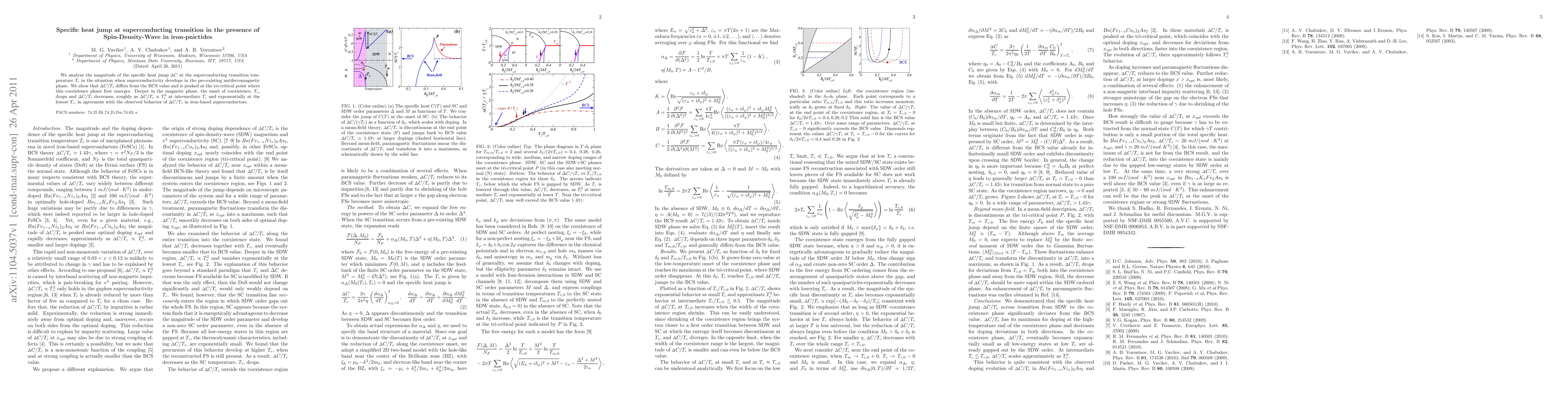 This study investigates the specific heat jump (\Delta C) at the superconducting transition temperature (T_c) in iron-pnictides where superconductivity emerges alongside an antiferromagnetic phase. The specific heat jump deviates from BCS theory values and peaks at the tri-critical point, showing a T^2_c dependence at intermediate T_c and an exponential decrease at the lowest T_c, consistent with observations in iron-based superconductors.