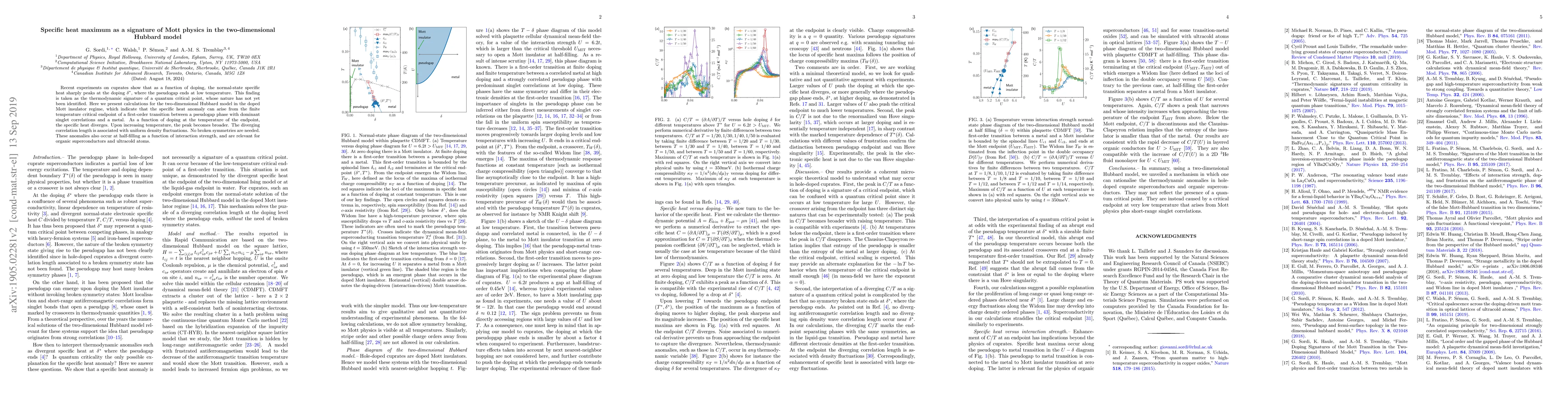 This paper investigates the specific heat maximum in the two-dimensional Hubbard model, identifying it as a signature of Mott physics. The study finds that the peak in specific heat at a critical doping level $\delta^*$ indicates a first-order transition between a pseudogap phase and a metallic state, without requiring broken symmetries.