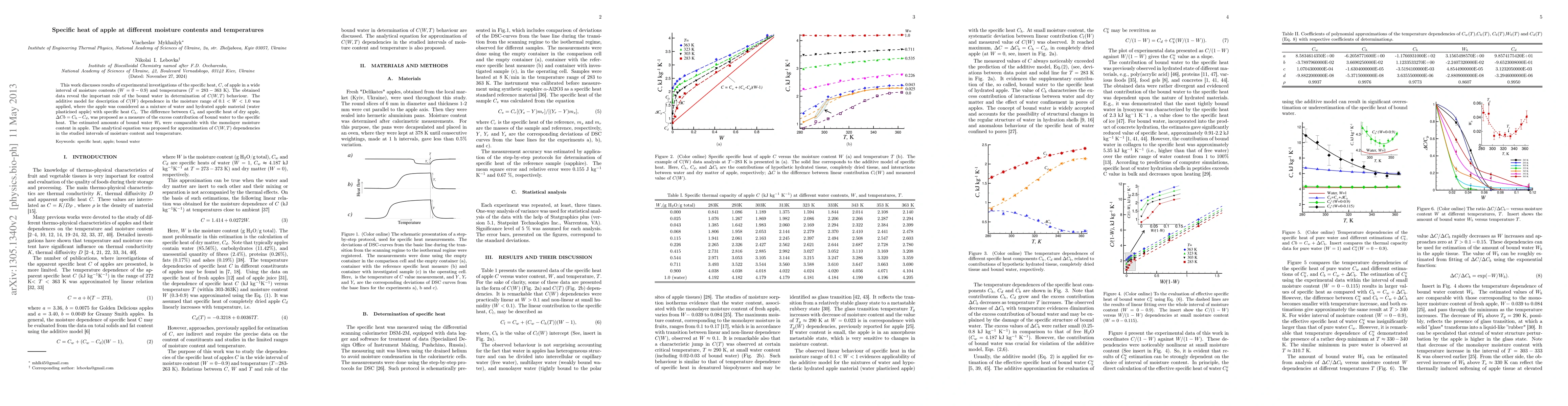Researchers investigated how moisture content affects apple's specific heat at different temperatures, finding that bound water significantly impacts its behavior. An analytical equation was proposed to approximate the relationship between moisture content and temperature.