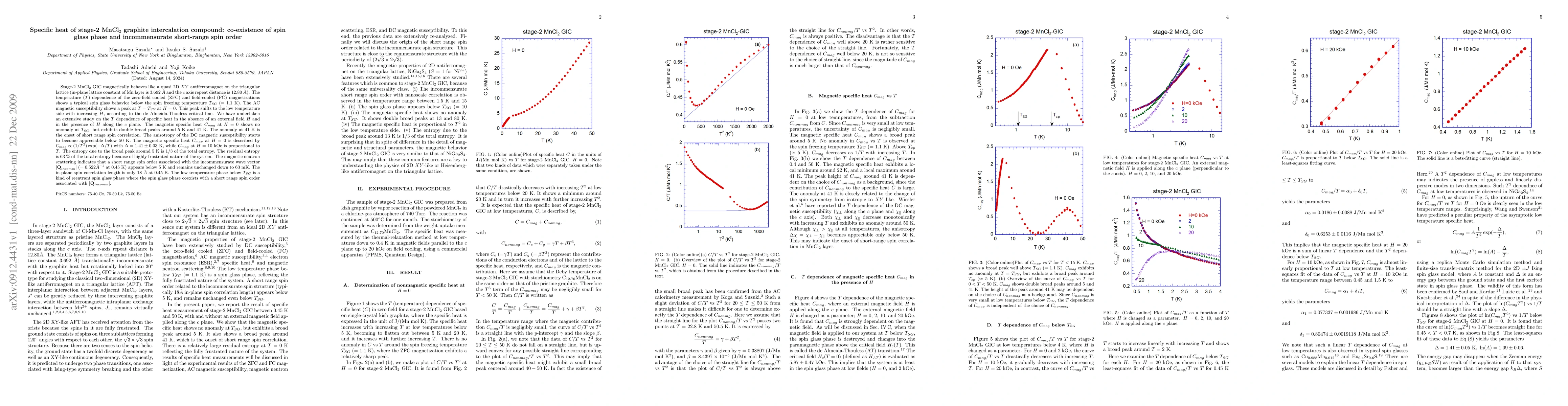 The paper presents detailed specific heat measurements and magnetic susceptibility studies, revealing the double broad peaks in specific heat and the coexistence of spin glass and short-range spin order phases in stage-2 MnCl2 GIC.
