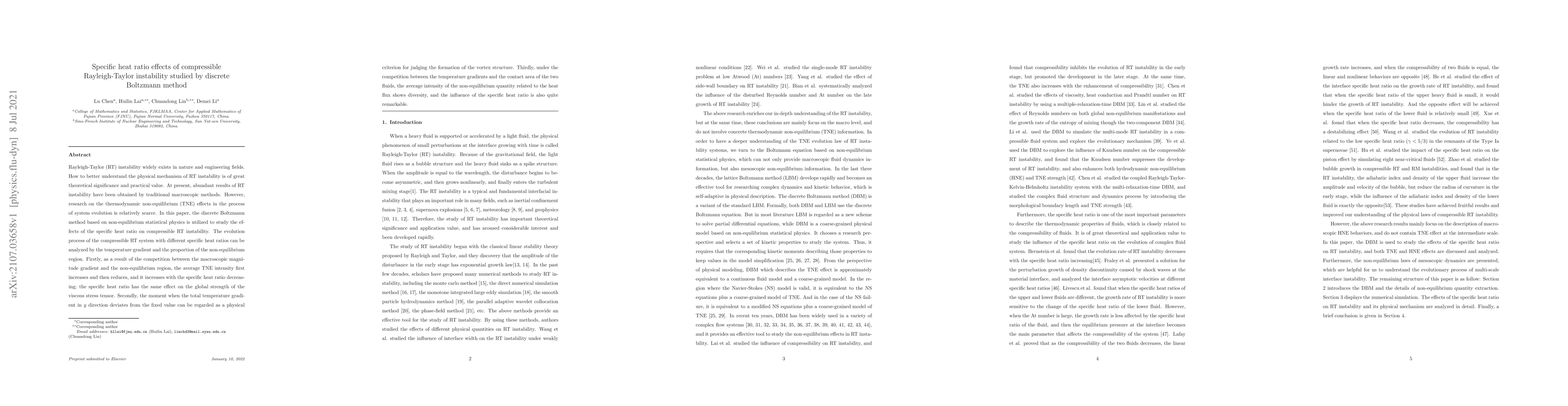 This work presents a novel approach to studying the Rayleigh-Taylor instability in compressible fluids using a discrete Boltzmann model.