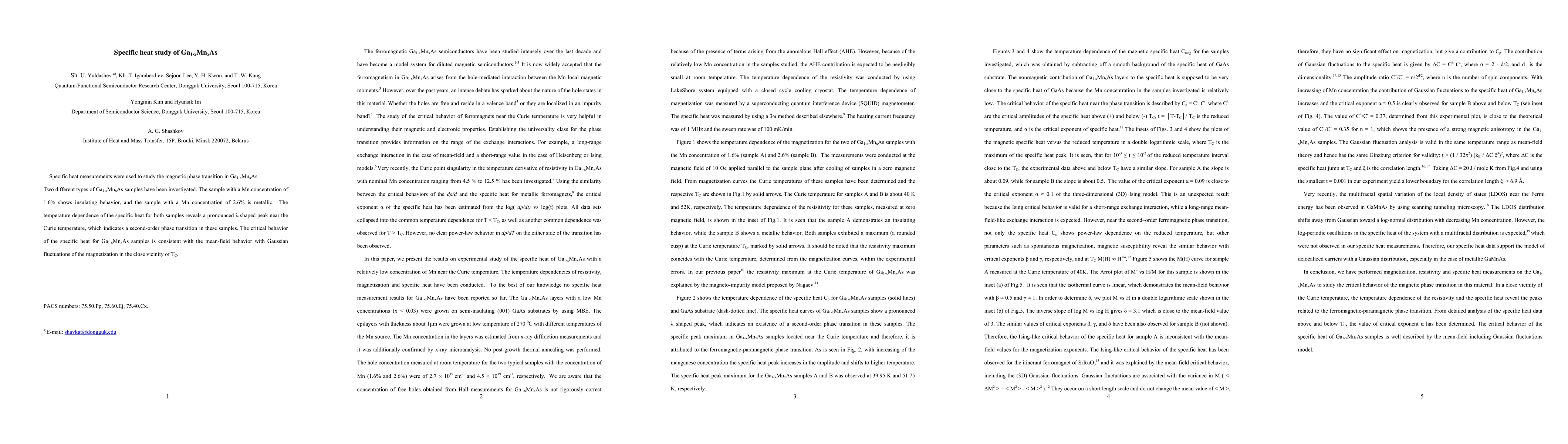 This study investigates the magnetic phase transition in Ga1-xMnxAs using specific heat measurements, revealing a lambda-shaped peak near the Curie temperature indicative of a second-order phase transition. The samples show different behaviors based on Mn concentration, with 1.6% Mn leading to insulating behavior and 2.6% Mn resulting in metallic characteristics.