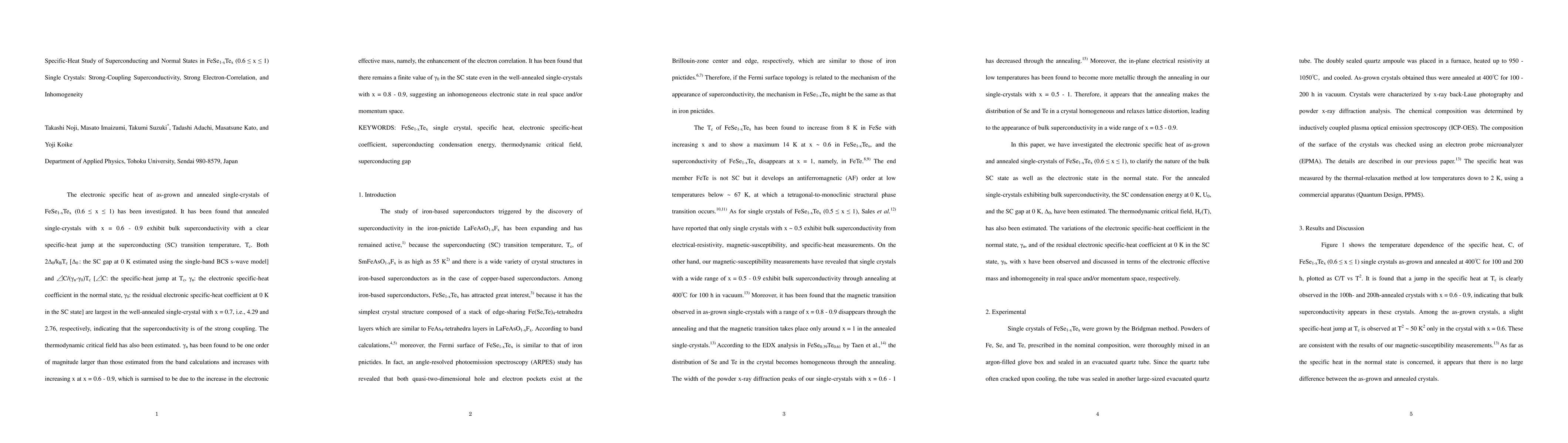 The electronic specific heat of as-grown and annealed single-crystals of FeSe1-xTex (0.6<=x<=1) has been investigated. It has been found that annealed single-crystals with x=0.6-0.9 exhibit bulk superconductivity with a clear specific-heat jump at the superconducting (SC) transition temperature, Tc. Both 2Delta_0/kBTc [Delta_0: the SC gap at 0 K estimated using the single-band BCS s-wave model] and Delta C/(gamma_n-gamma_0)Tc [Delta C$: the specific-heat jump at Tc, gamma_n: the electronic specific-heat coefficient in the normal state, gamma_0: the residual electronic specific-heat coefficient at 0 K in the SC state] are largest in the well-annealed single-crystal with x=0.7, i.e., 4.29 and 2.76, respectively, indicating that the superconductivity is of the strong coupling. The thermodynamic critical field has also been estimated. gamma_n has been found to be one order of magnitude larger than those estimated from the band calculations and increases with increasing x at x=0.6-0.9, which is surmised to be due to the increase in the electronic effective mass, namely, the enhancement of the electron correlation. It has been found that there remains a finite value of gamma_0 in the SC state even in the well-annealed single-crystals with x=0.8-0.9, suggesting an inhomogeneous electronic state in real space and/or momentum space.