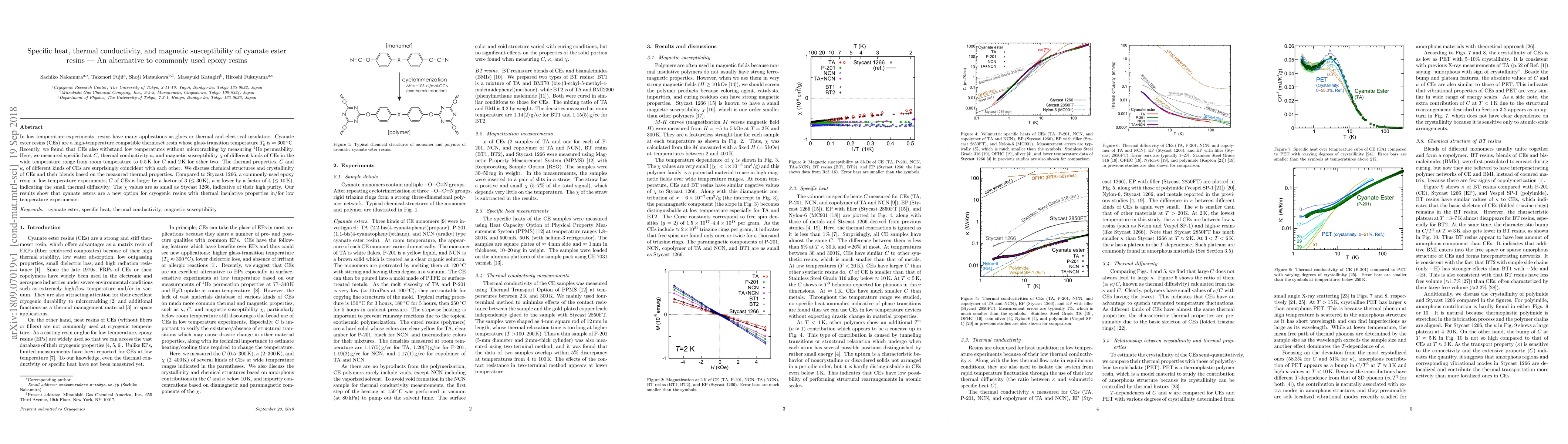 This study measures specific heat, thermal conductivity, and magnetic susceptibility of cyanate ester resins (CEs) across a broad temperature range. CEs show high thermal stability and unique thermal properties, with specific heat three times and thermal conductivity four times lower than commonly used epoxy resins, suggesting their potential as superior cryogenic resins.