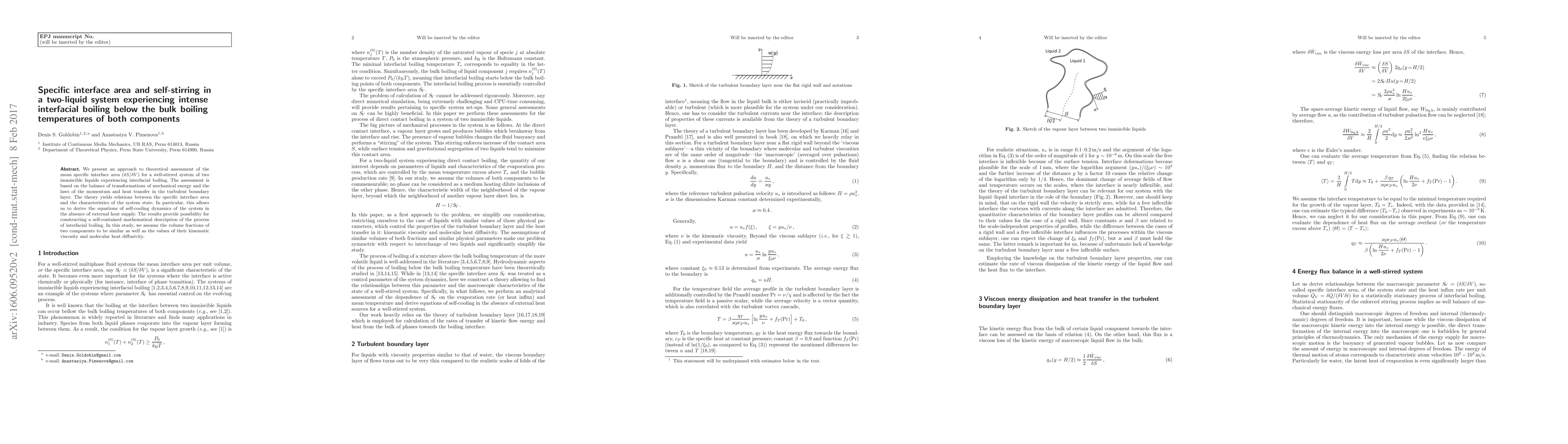 We present an approach to theoretical assessment of the mean specific interface area $(\delta{S}/\delta{V})$ for a well-stirred system of two immiscible liquids experiencing interfacial boiling. The assessment is based on the balance of transformations of mechanical energy and the laws of the momentum and heat transfer in the turbulent boundary layer. The theory yields relations between the specific interface area and the characteristics of the system state. In particular, this allows us to derive the equations of self-cooling dynamics of the system in the absence of external heat supply. The results provide possibility for constructing a self-contained mathematical description of the process of interfacial boiling. In this study, we assume the volume fractions of two components to be similar as well as the values of their kinematic viscosity and molecular heat diffusivity.