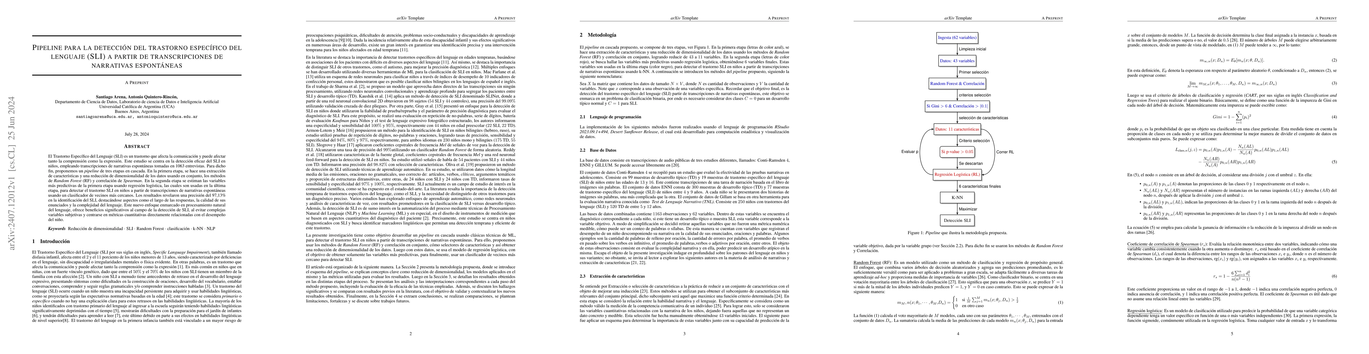 Specific Language Impairment (SLI) is a disorder that affects communication and can affect both comprehension and expression. This study focuses on effectively detecting SLI in children using transcripts of spontaneous narratives from 1063 interviews. A three-stage cascading pipeline was proposed f. In the first stage, feature extraction and dimensionality reduction of the data are performed using the Random Forest (RF) and Spearman correlation methods. In the second stage, the most predictive variables from the first stage are estimated using logistic regression, which is used in the last stage to detect SLI in children from transcripts of spontaneous narratives using a nearest neighbor classifier. The results revealed an accuracy of 97.13% in identifying SLI, highlighting aspects such as the length of the responses, the quality of their utterances, and the complexity of the language. This new approach, framed in natural language processing, offers significant benefits to the field of SLI detection by avoiding complex subjective variables and focusing on quantitative metrics directly related to the child's performance.