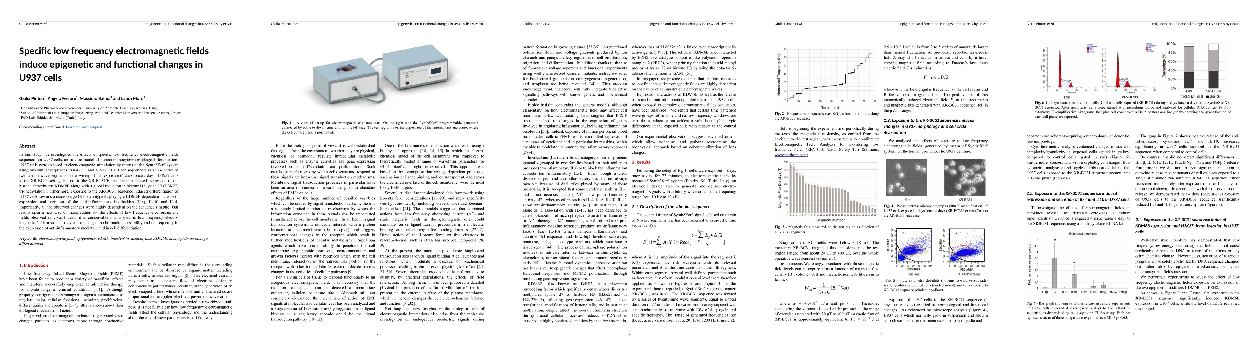 This research shows that specific low-frequency electromagnetic fields, using sequences XR-BC31 but not XR-BC31/F, can alter U937 cells (a model of human monocyte/macrophage differentiation). These fields increase the expression of histone demethylase KDM6B, reduce H3K27 tri-methylation, and promote differentiation into anti-inflammatory macrophage-like cells. The effects are sequence-dependent, suggesting potential for electromagnetic field treatments to influence chromatin accessibility and expression of anti-inflammatory mediators.