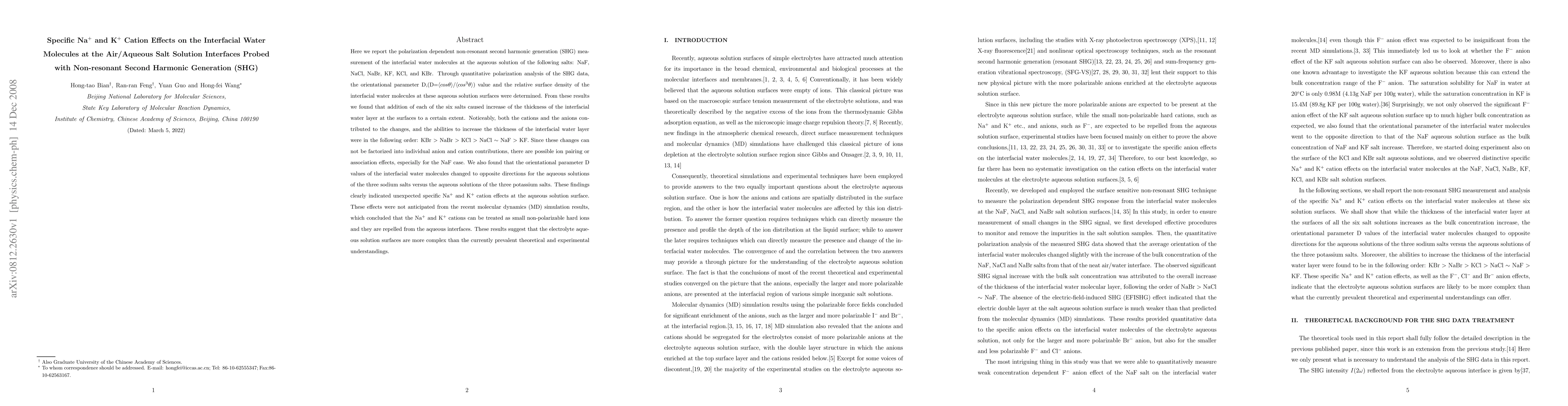 This study uses non-resonant second harmonic generation (SHG) to investigate the effects of Na+ and K+ cations on interfacial water molecules at the air/aqueous salt solution interface. Results show specific cation effects altering the thickness and orientation of interfacial water, challenging current theoretical models.