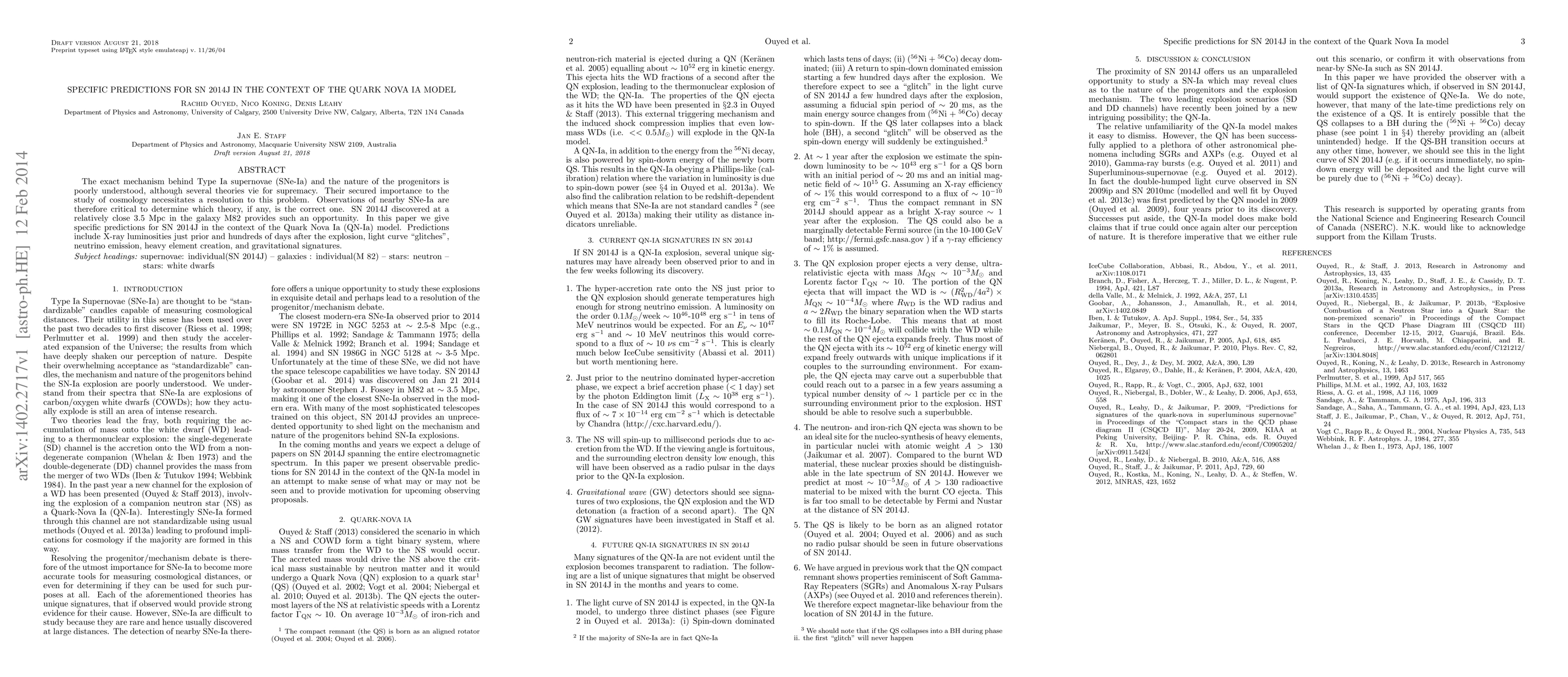 This paper presents specific predictions for SN 2014J based on the Quark Nova Ia model, focusing on X-ray luminosities, light curve 'glitches', neutrino emission, heavy element creation, and gravitational signatures to aid in understanding the SN-Ia mechanism.