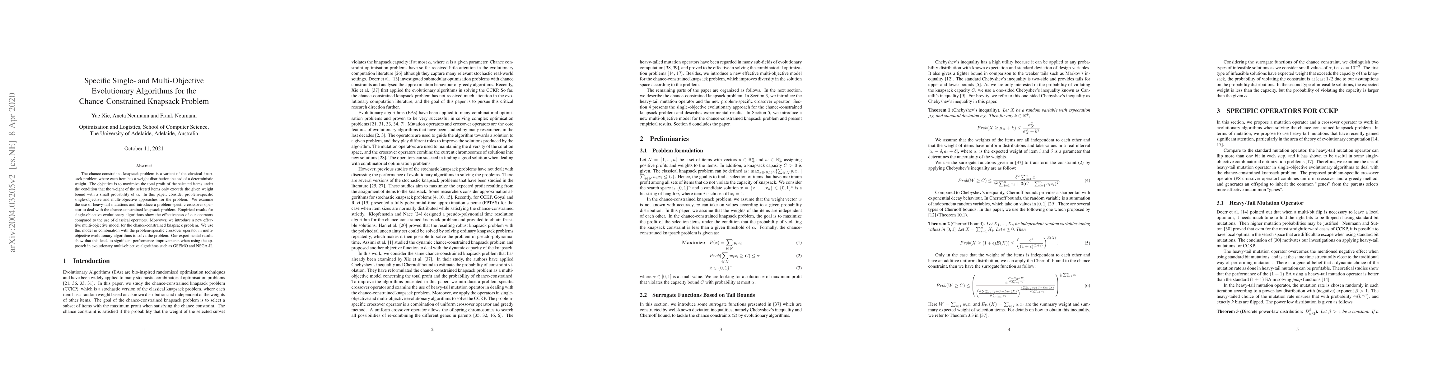 This paper proposes specific single- and multi-objective evolutionary algorithms for the chance-constrained knapsack problem, introducing heavy-tail mutations and a custom crossover operator. Experimental results demonstrate significant performance improvements over classical operators, especially in multi-objective evolutionary algorithms like GSEMO and NSGA-II.