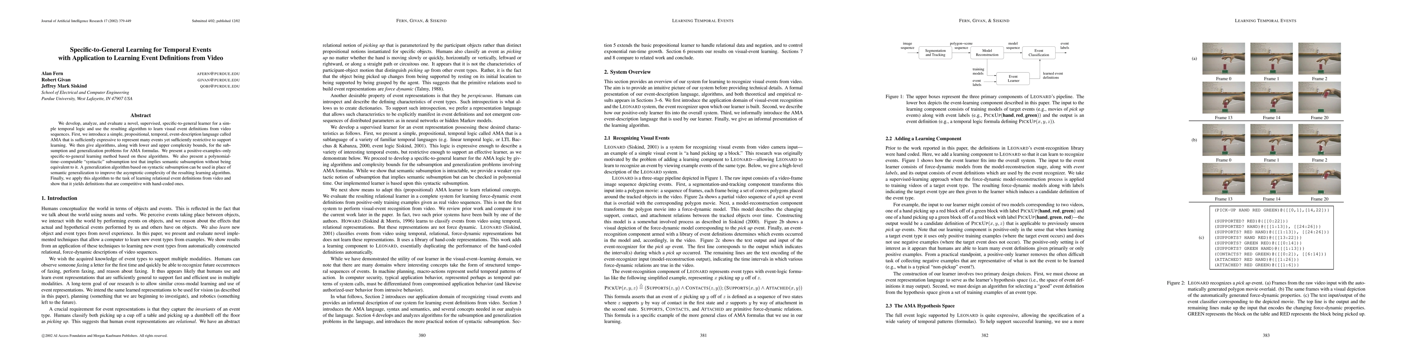 We develop, analyze, and evaluate a novel, supervised, specific-to-general learner for a simple temporal logic and use the resulting algorithm to learn visual event definitions from video sequences. First, we introduce a simple, propositional, temporal, event-description language called AMA that is sufficiently expressive to represent many events yet sufficiently restrictive to support learning. We then give algorithms, along with lower and upper complexity bounds, for the subsumption and generalization problems for AMA formulas. We present a positive-examples--only specific-to-general learning method based on these algorithms. We also present a polynomial-time--computable ``syntactic'' subsumption test that implies semantic subsumption without being equivalent to it. A generalization algorithm based on syntactic subsumption can be used in place of semantic generalization to improve the asymptotic complexity of the resulting learning algorithm. Finally, we apply this algorithm to the task of learning relational event definitions from video and show that it yields definitions that are competitive with hand-coded ones.