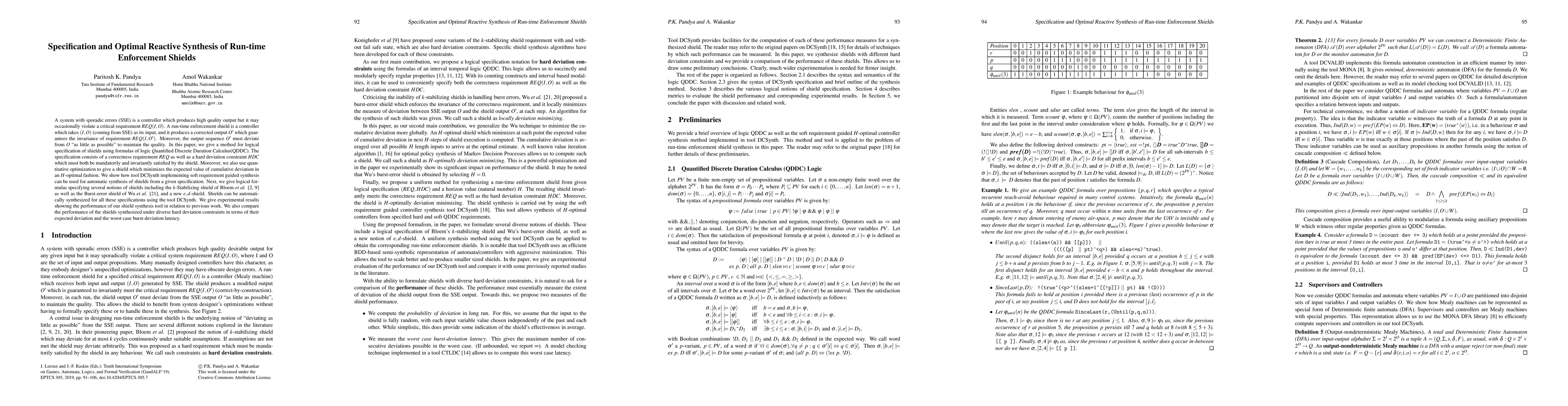 A system with sporadic errors (SSE) is a controller which produces high quality output but it may occasionally violate a critical requirement REQ(I,O). A run-time enforcement shield is a controller which takes (I,O) (coming from SSE) as its input, and it produces a corrected output O' which guarantees the invariance of requirement REQ(I,O'). Moreover, the output sequence O' must deviate from O "as little as possible" to maintain the quality. In this paper, we give a method for logical specification of shields using formulas of logic Quantified Discrete Duration Calculus (QDDC). The specification consists of a correctness requirement REQ as well as a hard deviation constraint HDC which must both be mandatorily and invariantly satisfied by the shield. Moreover, we also use quantitative optimization to give a shield which minimizes the expected value of cumulative deviation in an H-optimal fashion. We show how tool DCSynth implementing soft requirement guided synthesis can be used for automatic synthesis of shields from a given specification. Next, we give logical formulas specifying several notions of shields including the k-Stabilizing shield of Bloem "et al." as well as the Burst-error shield of Wu "et al.", and a new e,d-shield. Shields can be automatically synthesized for all these specifications using the tool DCSynth. We give experimental results showing the performance of our shield synthesis tool in relation to previous work. We also compare the performance of the shields synthesized under diverse hard deviation constraints in terms of their expected deviation and the worst case burst-deviation latency.