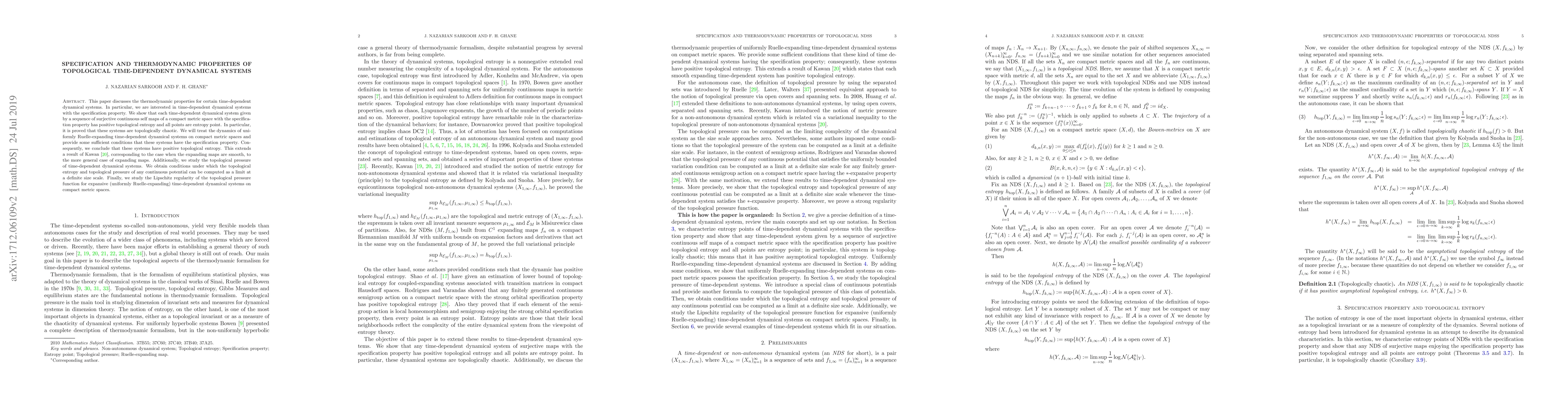 This paper explores thermodynamic properties of time-dependent dynamical systems with the specification property, proving they exhibit positive topological entropy and topological chaos. It also extends results on uniformly Ruelle-expanding maps to more general cases and studies the topological pressure and Lipschitz regularity of these systems.