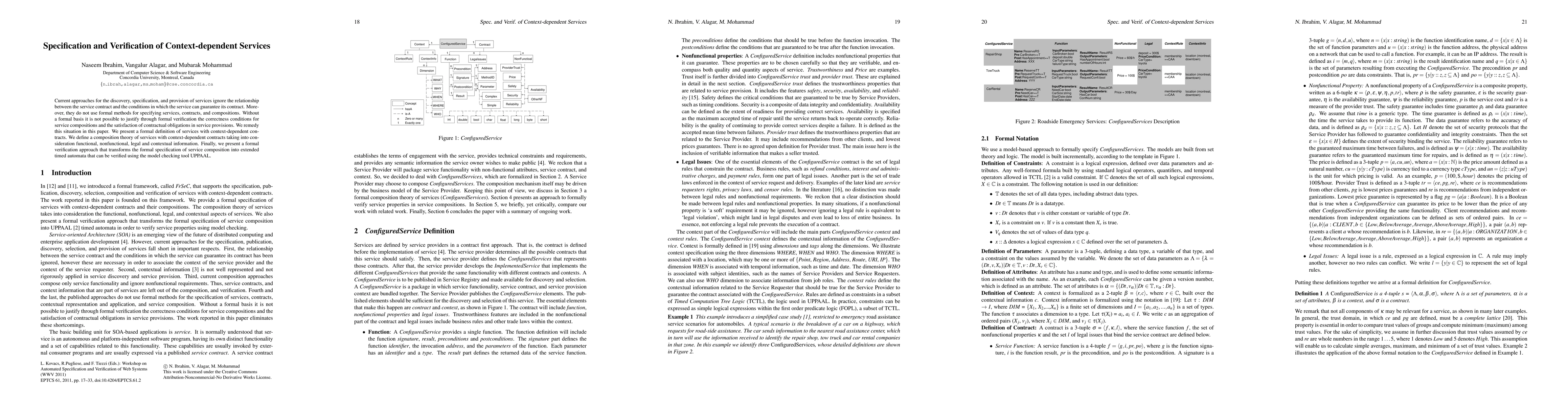 This paper proposes a formal definition of context-dependent services with contracts, allowing for verification of correctness conditions through model checking tools like UPPAAL. It addresses the limitations of current approaches in service discovery, specification, and provision by providing a composition theory and formal verification approach.
