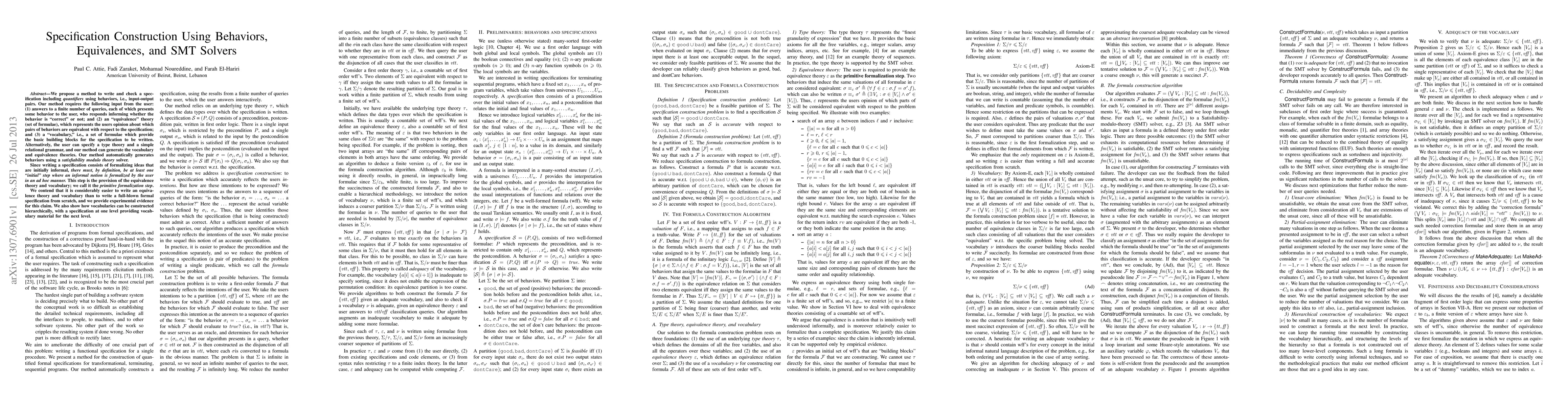 We propose a method to write and check a specification including quantifiers using behaviors, i.e., input-output pairs. Our method requires the following input from the user: (1) answers to a finite number of queries, each of which presents some behavior to the user, who responds informing whether the behavior is "correct" or not; and (2) an "equivalence" theory (set of formulae), which represents the users opinion about which pairs of behaviors are equivalent with respect to the specification; and (3) a "vocabulary", i.e., a set of formulae which provide the basic building blocks for the specification to be written. Alternatively, the user can specify a type theory and a simple relational grammar, and our method can generate the vocabulary and equivalence theories. Our method automatically generates behaviors using a satisfiability modulo theory solver. Since writing a specification consists of formalizing ideas that are initially informal, there must, by definition, be at least one "initial" step where an informal notion is formalized by the user in an ad hoc manner. This step is the provision of the equivalence theory and vocabulary; we call it the primitive formalization step. We contend that it is considerably easier to write an equivalence theory and vocabulary than to write a full-blown formal specification from scratch, and we provide experimental evidence for this claim. We also show how vocabularies can be constructed hierarchically, with a specification at one level providing vocabulary material for the next level.