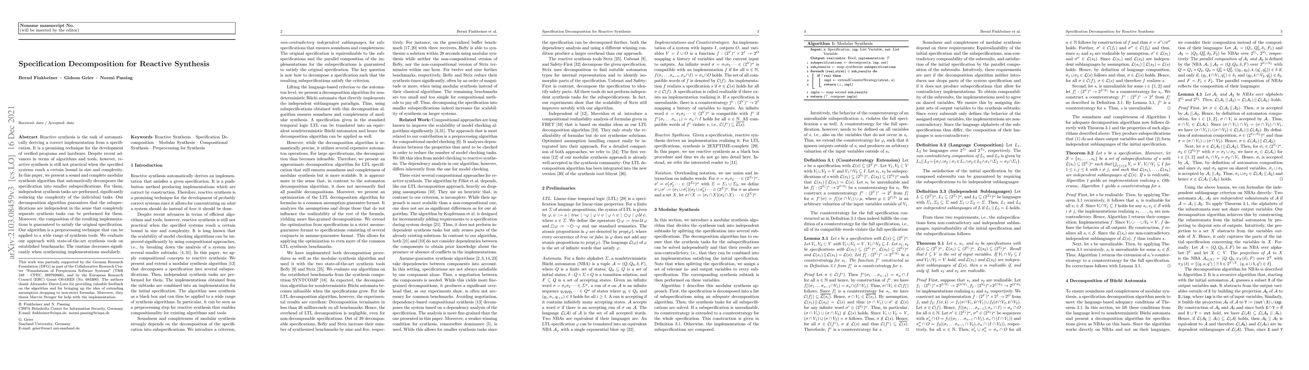 This paper introduces a modular synthesis algorithm that decomposes complex specifications into smaller, independent subspecifications to facilitate more efficient reactive synthesis. The algorithm ensures that the synthesized components can be composed to satisfy the original specification, leading to significant reductions in synthesis runtime on benchmarks.