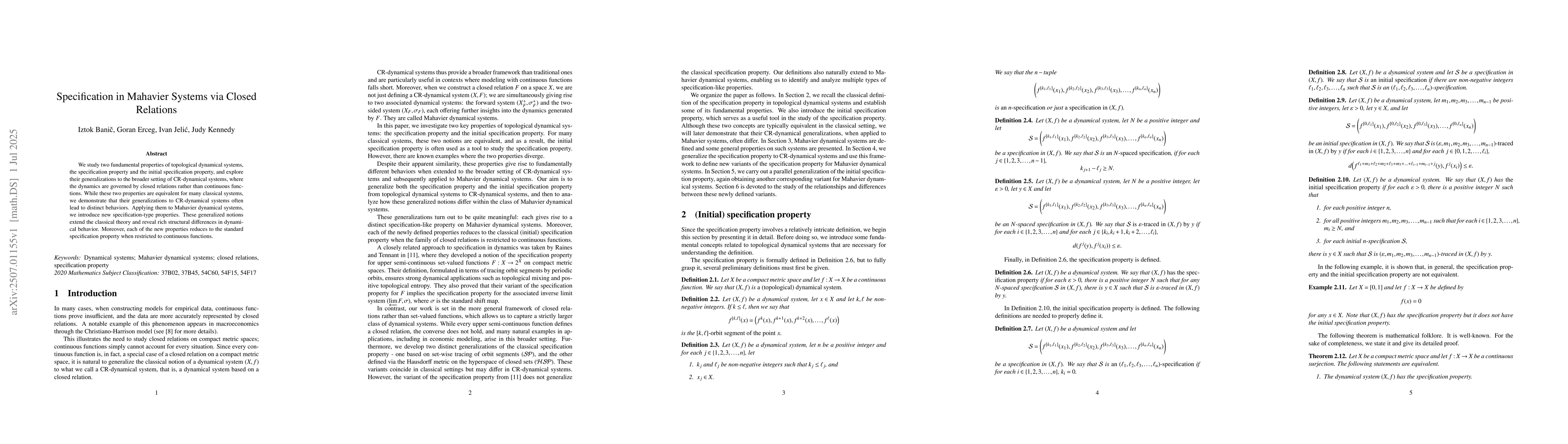 We study two fundamental properties of topological dynamical systems, the specification property and the initial specification property, and explore their generalizations to the broader setting of CR-dynamical systems, where the dynamics are governed by closed relations rather than continuous functions. While these two properties are equivalent for many classical systems, we demonstrate that their generalizations to CR-dynamical systems often lead to distinct behaviors. Applying them to Mahavier dynamical systems, we introduce new specification-type properties. These generalized notions extend the classical theory and reveal rich structural differences in dynamical behavior. Moreover, each of the new properties reduces to the standard specification property when restricted to continuous functions.