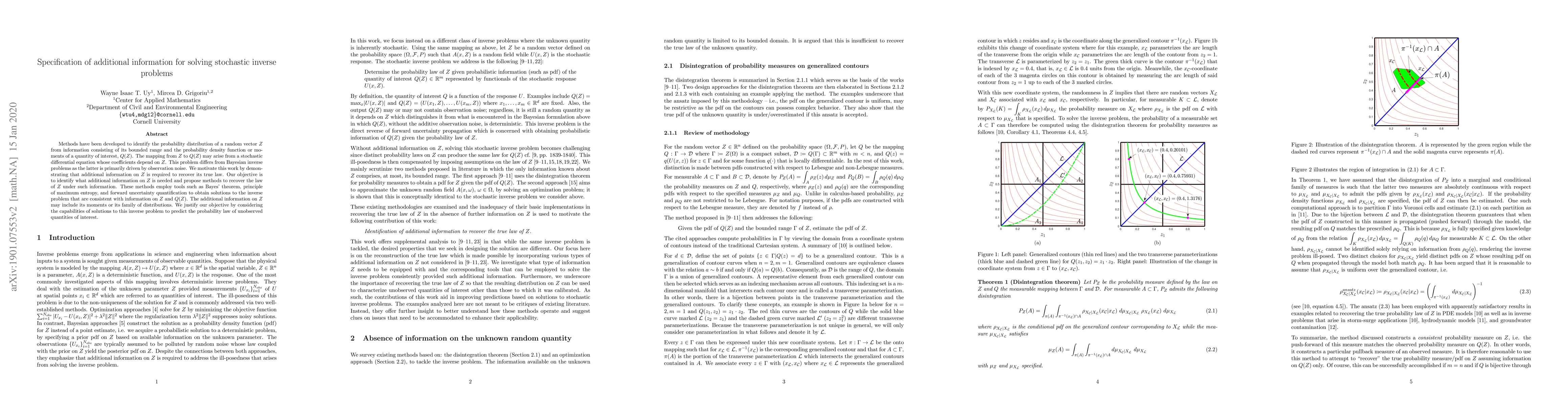 Methods have been developed to identify the probability distribution of a random vector $Z$ from information consisting of its bounded range and the probability density function or moments of a quantity of interest, $Q(Z)$. The mapping from $Z$ to $Q(Z)$ may arise from a stochastic differential equation whose coefficients depend on $Z$. This problem differs from Bayesian inverse problems as the latter is primarily driven by observation noise. We motivate this work by demonstrating that additional information on $Z$ is required to recover its true law. Our objective is to identify what additional information on $Z$ is needed and propose methods to recover the law of $Z$ under such information. These methods employ tools such as Bayes' theorem, principle of maximum entropy, and forward uncertainty quantification to obtain solutions to the inverse problem that are consistent with information on $Z$ and $Q(Z)$. The additional information on $Z$ may include its moments or its family of distributions. We justify our objective by considering the capabilities of solutions to this inverse problem to predict the probability law of unobserved quantities of interest.