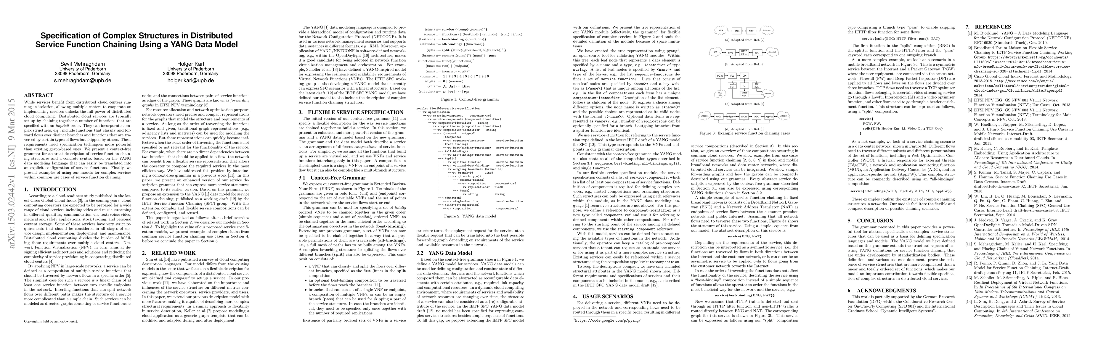 This paper proposes a YANG data model using a context-free grammar for specifying complex structures in distributed service function chaining, offering a more powerful method than existing graph-based techniques. It demonstrates practical applications of these models in common service function chaining scenarios.