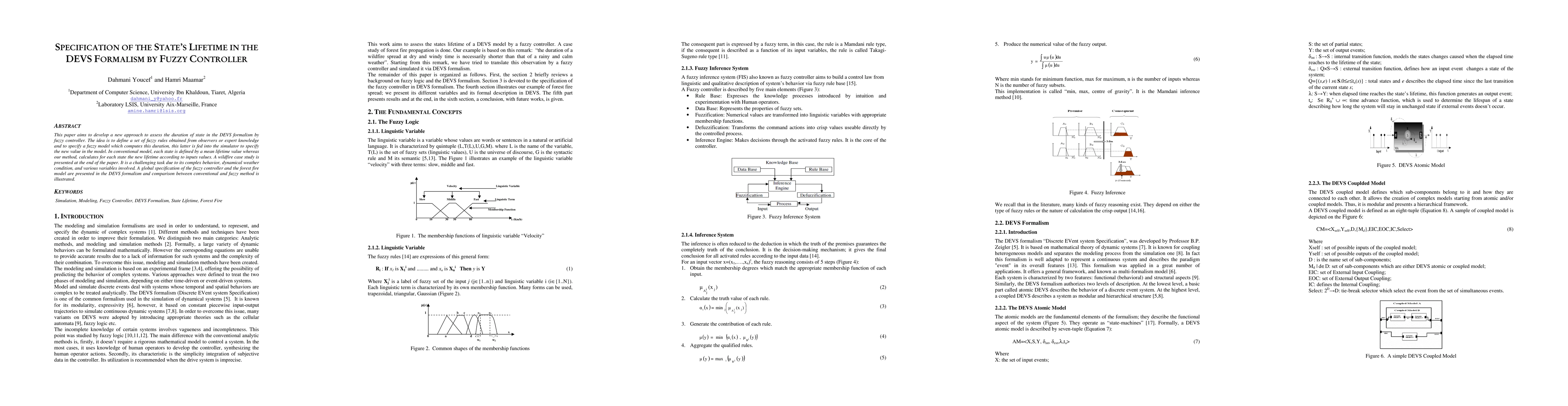 This paper aims to develop a new approach to assess the duration of state in the DEVS formalism by fuzzy controller. The idea is to define a set of fuzzy rules obtained from observers or expert knowledge and to specify a fuzzy model which computes this duration, this latter is fed into the simulator to specify the new value in the model. In conventional model, each state is defined by a mean lifetime value whereas our method, calculates for each state the new lifetime according to inputs values. A wildfire case study is presented at the end of the paper. It is a challenging task due to its complex behavior, dynamical weather condition, and various variables involved. A global specification of the fuzzy controller and the forest fire model are presented in the DEVS formalism and comparison between conventional and fuzzy method is illustrated.