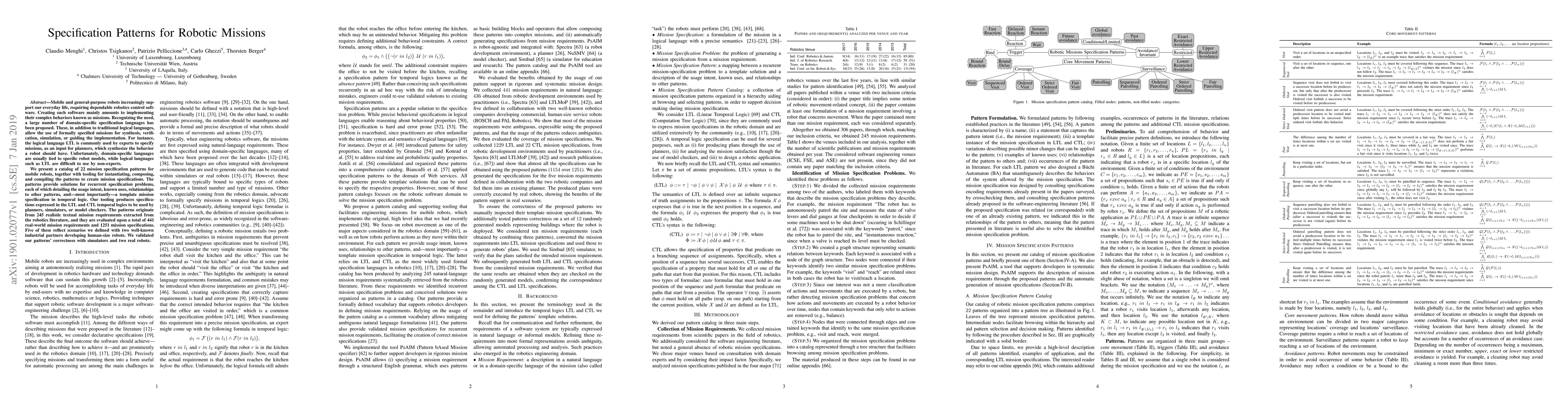 This work is novel as it proposes a comprehensive catalog of reusable mission specification patterns for mobile robots, supported by a tool (PsAlM) that simplifies the creation of formal mission specifications for developers.