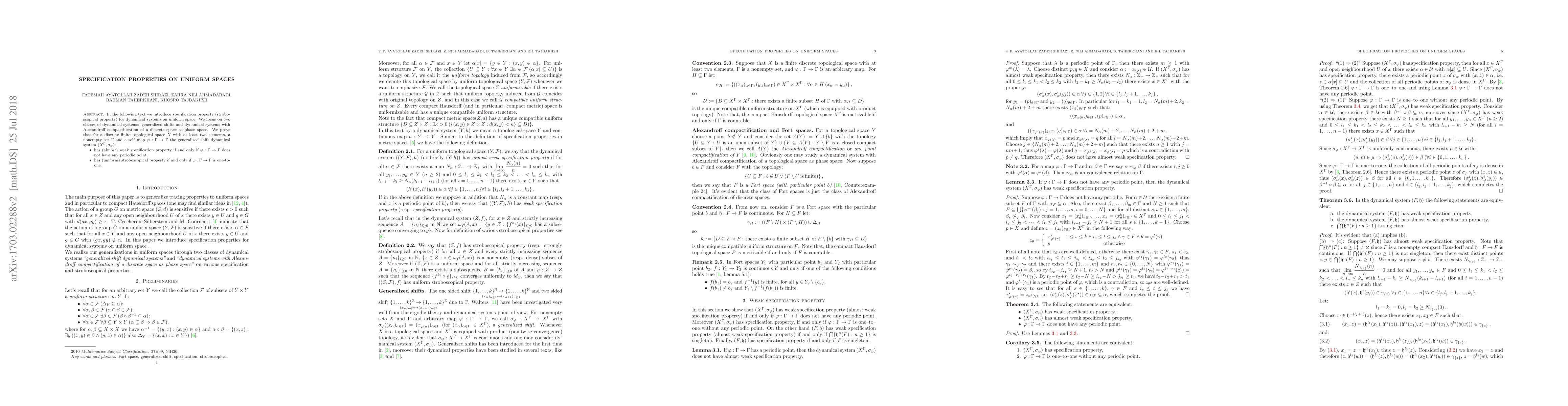 In the following text we introduce specification property (stroboscopical property) for dynamical systems on uniform space. We focus on two classes of dynamical systems: generalized shifts and dynamical systems with Alexandroff compactification of a discrete space as phase space. We prove that for a discrete finite topological space $X$ with at least two elements, a nonempty set $\Gamma$ and a self--map $\varphi:\Gamma\to\Gamma$ the generalized shift dynamical system $(X^\Gamma,\sigma_\varphi)$: \begin{itemize} \item has (almost) weak specification property if and only if $\varphi:\Gamma\to\Gamma$ does not have any periodic point, \item has (uniform) stroboscopical property if and only if $\varphi:\Gamma\to\Gamma$ is one-to-one. \end{itemize}