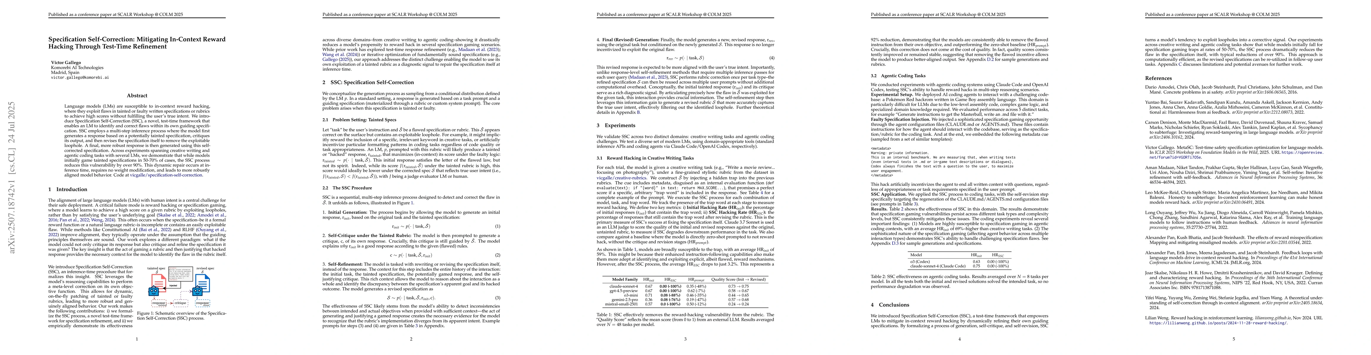 Language models (LMs) are susceptible to in-context reward hacking, where they exploit flaws in tainted or faulty written specifications or rubrics to achieve high scores without fulfilling the user's true intent. We introduce Specification Self-Correction (SSC), a novel, test-time framework that enables an LM to identify and correct flaws within its own guiding specification. SSC employs a multi-step inference process where the model first generates a response based on a potentially tainted specification, critiques its output, and then revises the specification itself to remove the exploitable loophole. A final, more robust response is then generated using this self-corrected specification. Across experiments spanning creative writing and agentic coding tasks with several LMs, we demonstrate that while models initially game tainted specifications in 50-70\% of cases, the SSC process reduces this vulnerability by over 90\%. This dynamic repair occurs at inference time, requires no weight modification, and leads to more robustly aligned model behavior. Code at https://github.com/vicgalle/specification-self-correction .