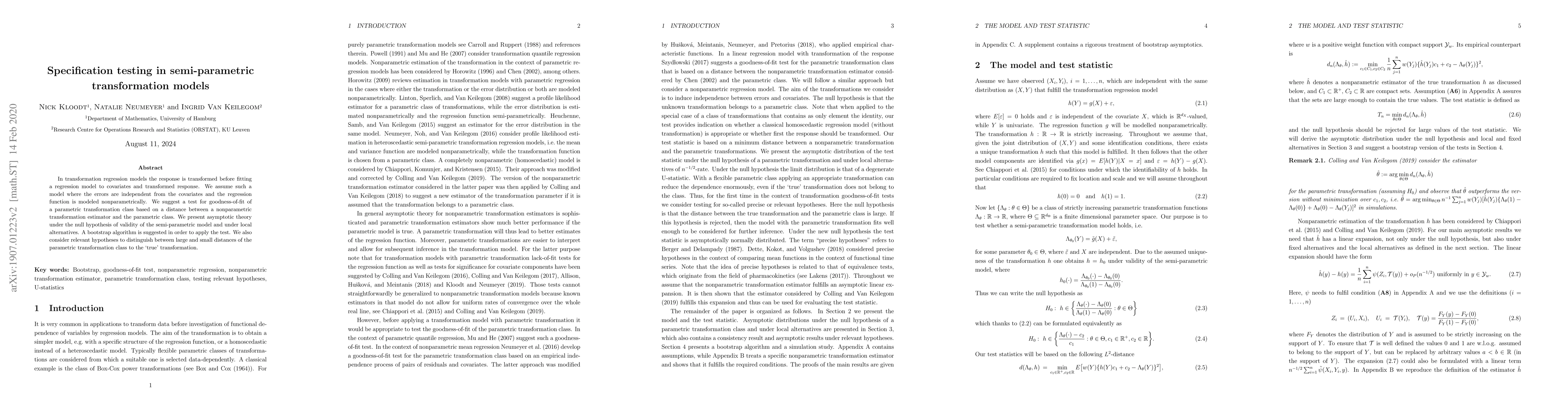 This paper proposes a specification test for semi-parametric transformation models, comparing a nonparametric estimator to a parametric transformation class using a distance metric. It develops an asymptotic theory and suggests a bootstrap method for practical application.