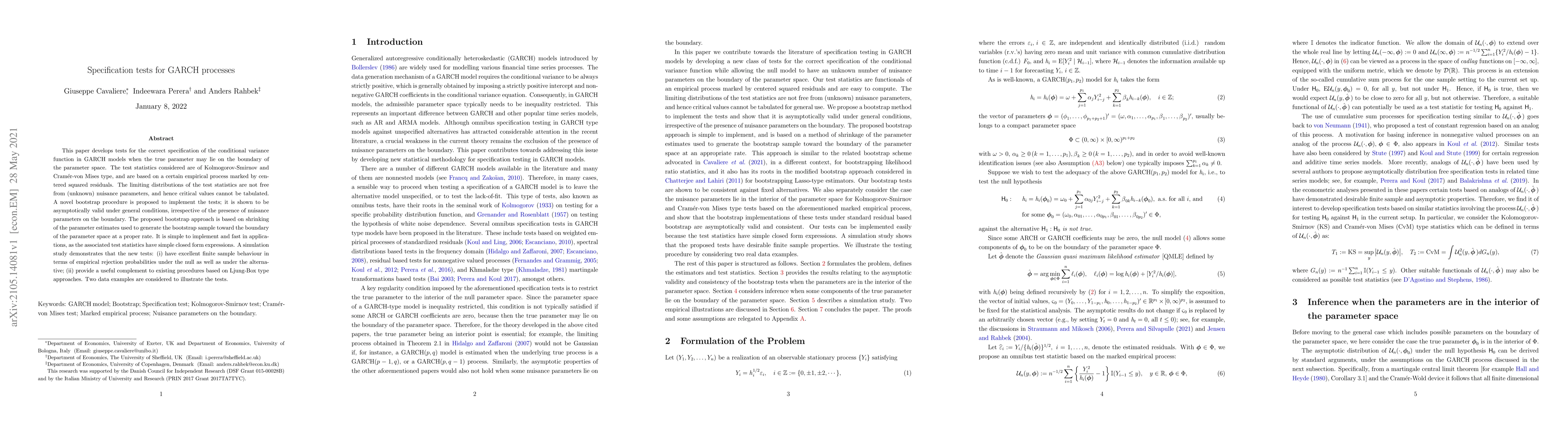 This paper proposes new tests for GARCH model specification using Kolmogorov-Smirnov and Cramér-von Mises statistics, addressing boundary parameter issues. A novel bootstrap method is introduced to handle unknown nuisance parameters, demonstrating excellent finite sample performance and complementing existing Ljung-Box type tests.