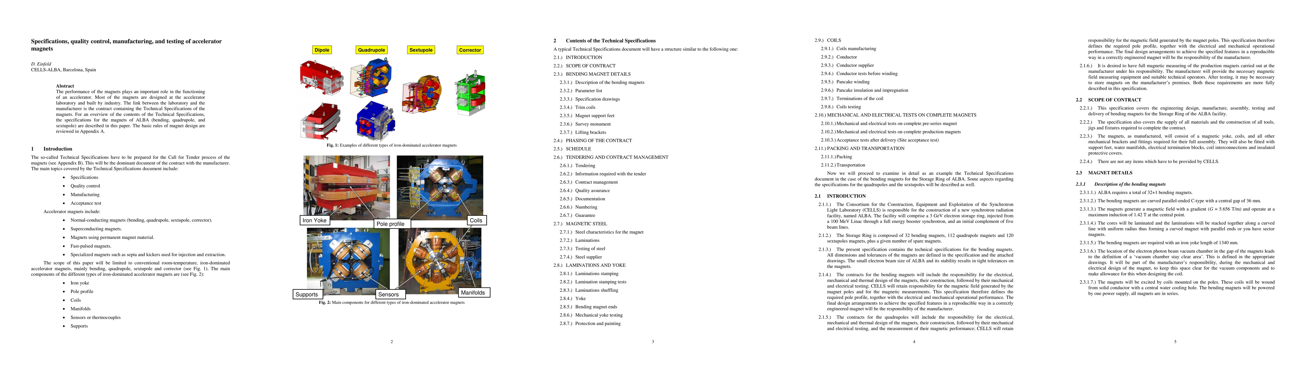 The performance of the magnets plays an important role in the functioning of an accelerator. Most of the magnets are designed at the accelerator laboratory and built by industry. The link between the laboratory and the manufacturer is the contract containing the Technical Specifications of the magnets. For an overview of the contents of the Technical Specifications, the specifications for the magnets of ALBA (bending, quadrupole, and sextupole) are described in this paper. The basic rules of magnet design are reviewed in Appendix A.