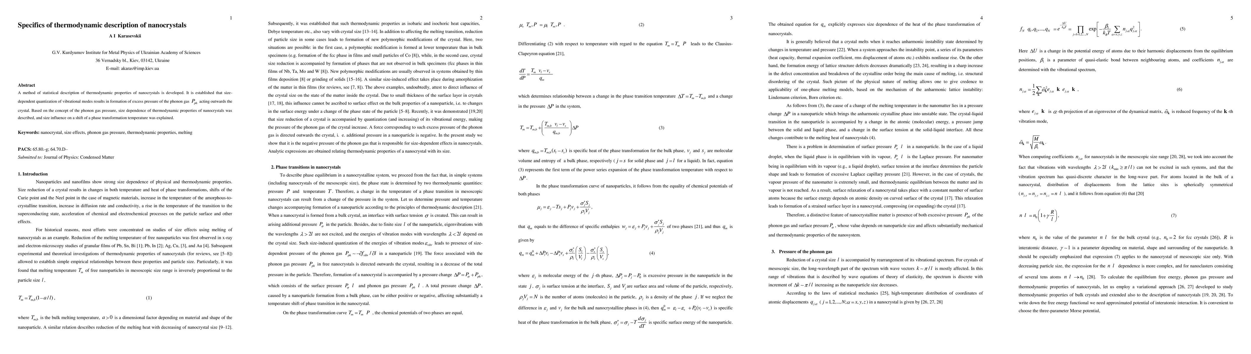 A method to describe thermodynamic properties of nanocrystals has been developed, showing that size-dependent vibrational modes create excess pressure acting outward the crystal, influencing its phase transformation temperature.