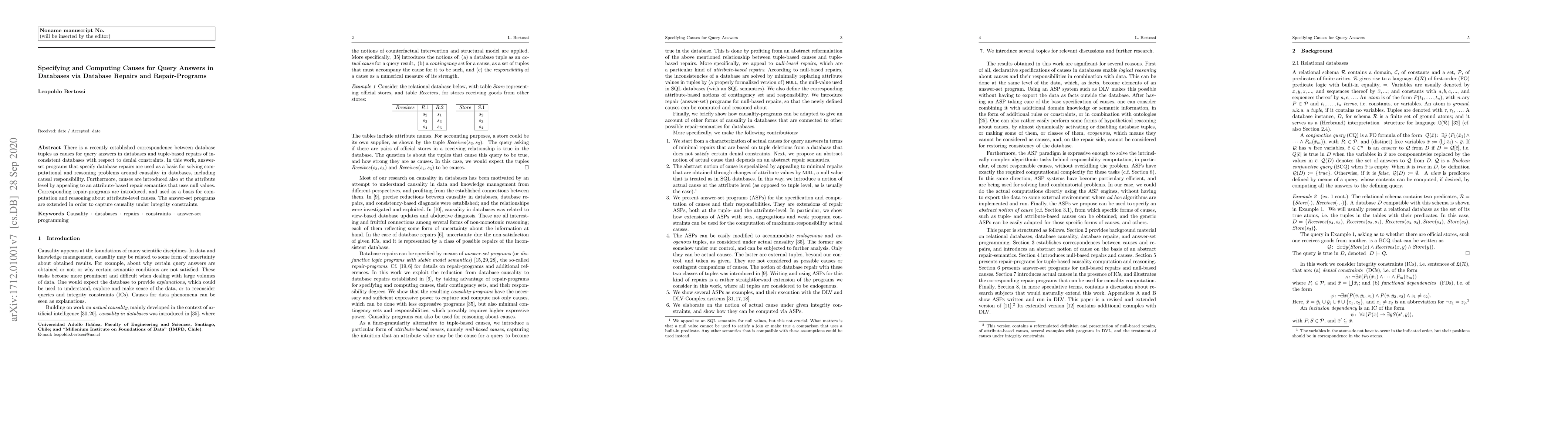 The paper presents a novel method for specifying and computing causes for query answers using answer-set programs and database repairs, extending the concept to attribute-level causes.