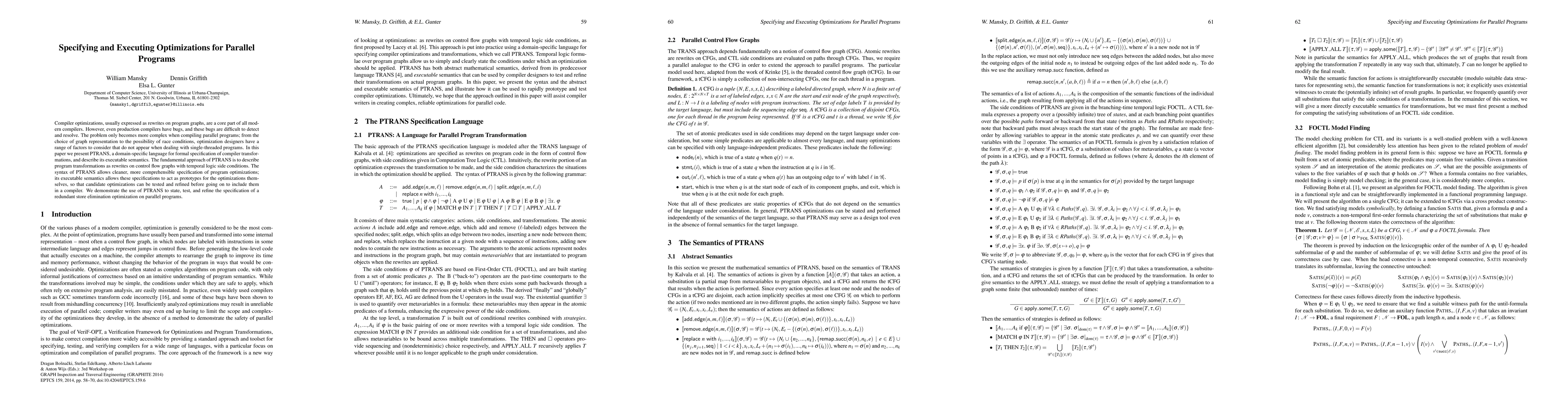 This paper introduces PTRANS, a domain-specific language for specifying compiler optimizations for parallel programs, using rewrites on control flow graphs with temporal logic. PTRANS enables clearer specification and executable semantics, allowing optimizations to be tested and refined before implementation.