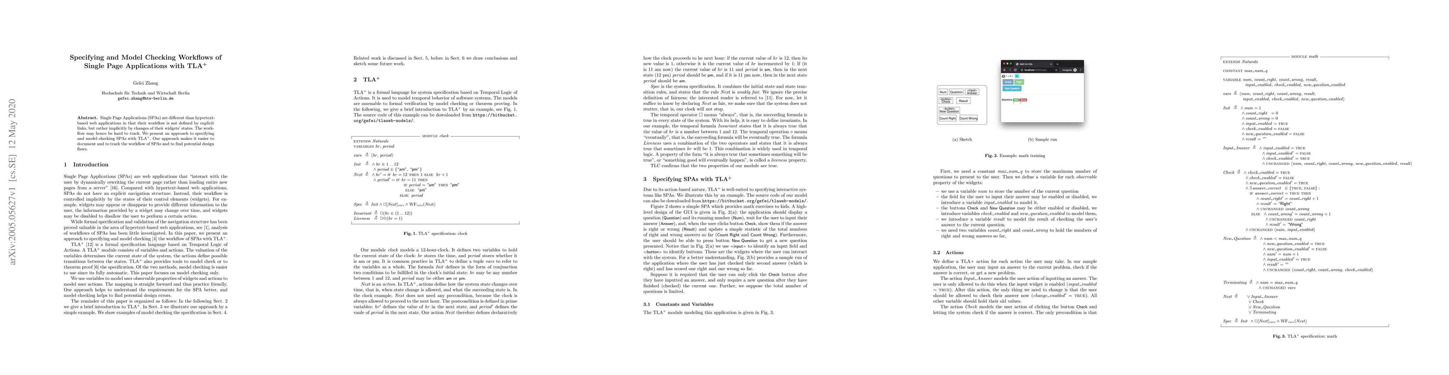 Single Page Applications (SPAs) are different than hypertext-based web applications in that their workflow is not defined by explicit links, but rather implicitly by changes of their widgets' states. The workflow may hence be hard to track. We present an approach to specifying and model checking SPAs with TLA+. Our approach makes it easier to document and to track the workflow of SPAs and to find potential design flaws.
