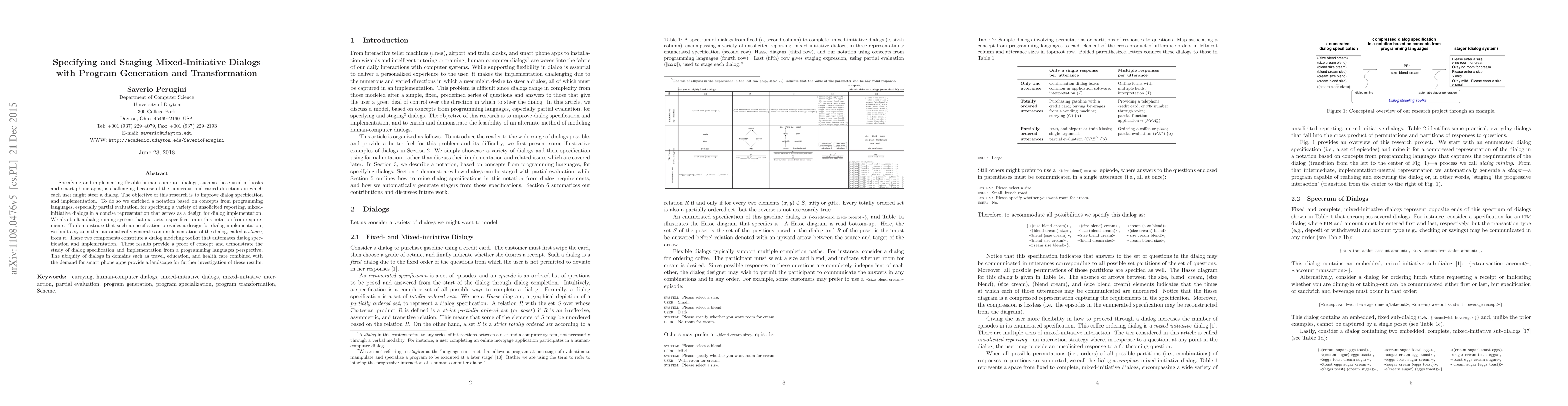 This paper proposes a notation enriched with programming concepts to specify mixed-initiative dialogs, and introduces a dialog mining system for automatic specification extraction. It demonstrates a stager system that generates dialog implementations, showcasing a toolkit for automating dialog modeling.
