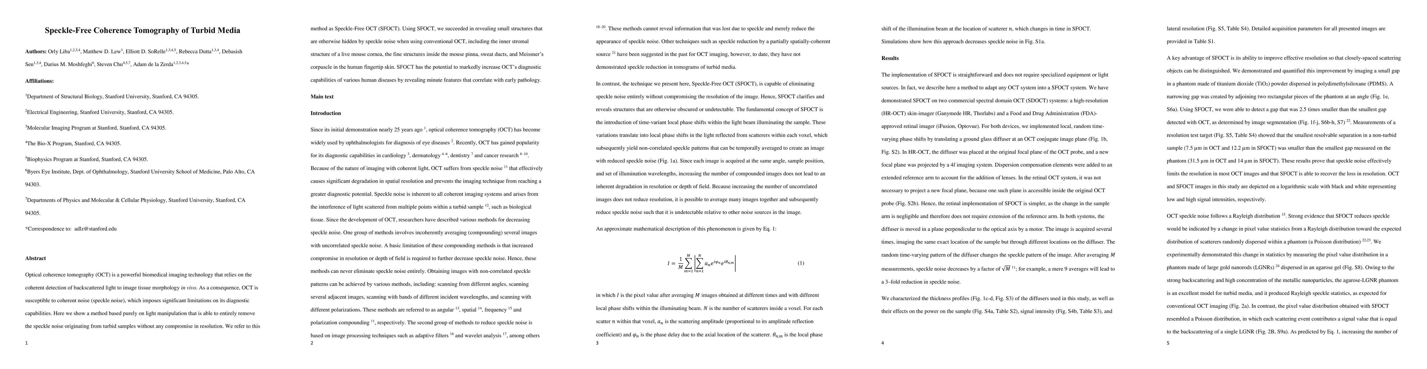 This paper introduces Speckle-Free OCT (SFOCT), a novel method that eliminates speckle noise from turbid samples without compromising resolution, enabling the visualization of previously hidden small structures in live tissue. SFOCT has the potential to significantly enhance OCT's diagnostic capabilities for various diseases by revealing minute pathological features.