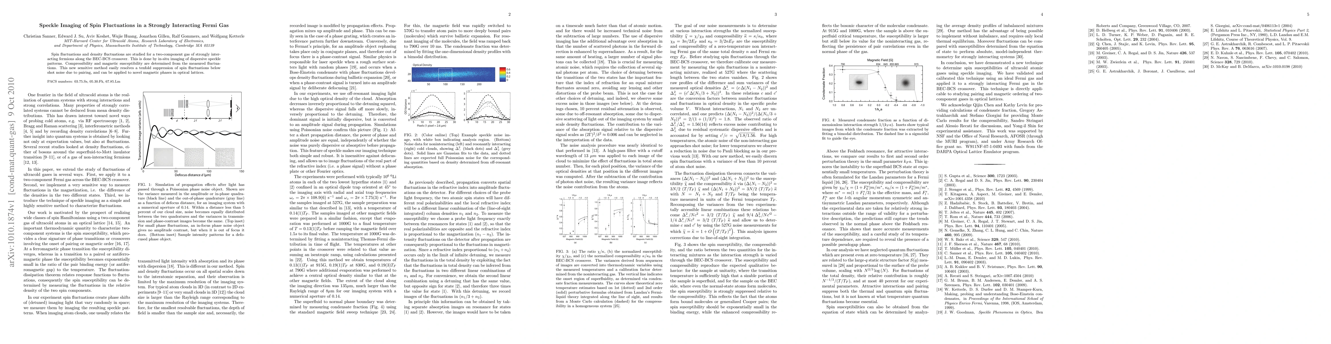 Spin fluctuations and density fluctuations are studied for a two-component gas of strongly interacting fermions along the BEC-BCS crossover. This is done by in-situ imaging of dispersive speckle patterns. Compressibility and magnetic susceptibility are determined from the measured fluctuations. This new sensitive method easily resolves a tenfold suppression of spin fluctuations below shot noise due to pairing, and can be applied to novel magnetic phases in optical lattices.