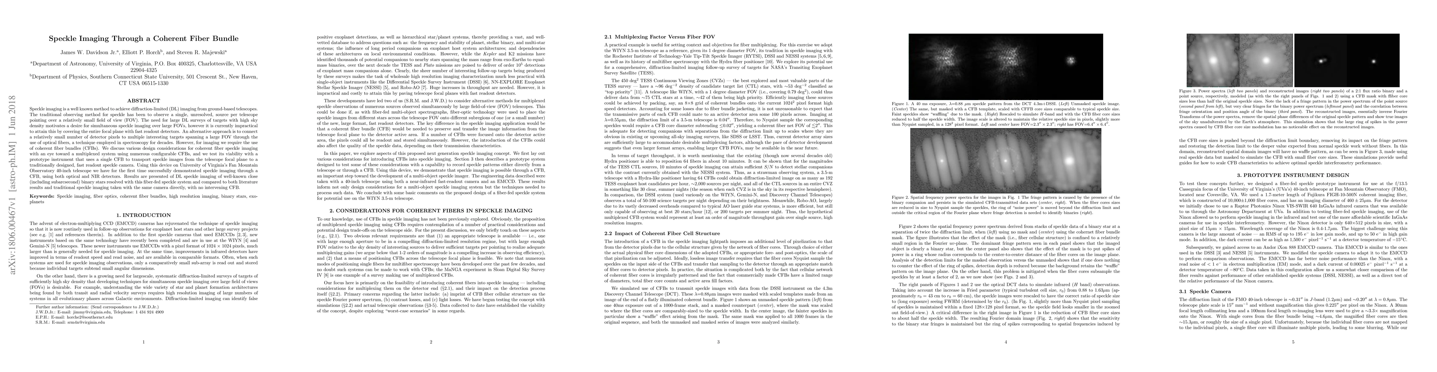 This paper explores the feasibility of using coherent fiber bundles (CFBs) for speckle imaging to achieve diffraction-limited imaging over large fields of view. A prototype system utilizing a single CFB to transport speckle images from a telescope to a fast readout camera was successfully tested, demonstrating the potential for multiplexed imaging systems.