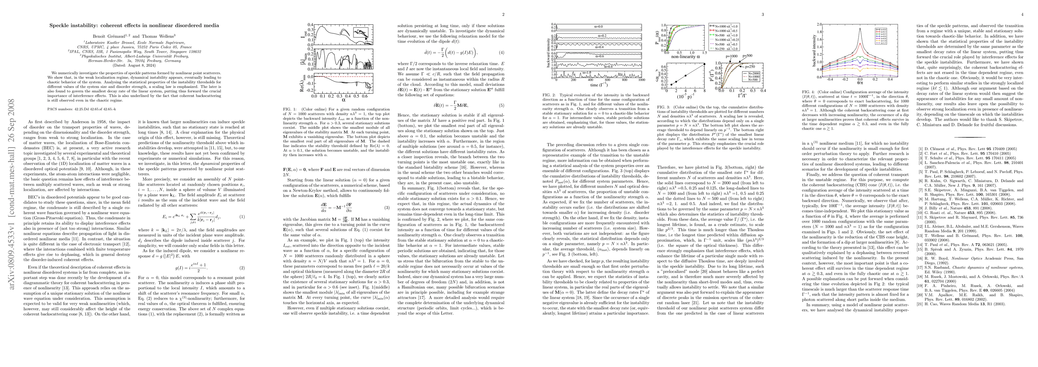 This paper numerically explores the dynamical instability in speckle patterns generated by nonlinear point scatterers, revealing chaotic behavior in the weak localization regime. It identifies a scaling law governing the instability thresholds and highlights the significance of interference effects, even in the chaotic regime, as evidenced by persistent coherent backscattering.