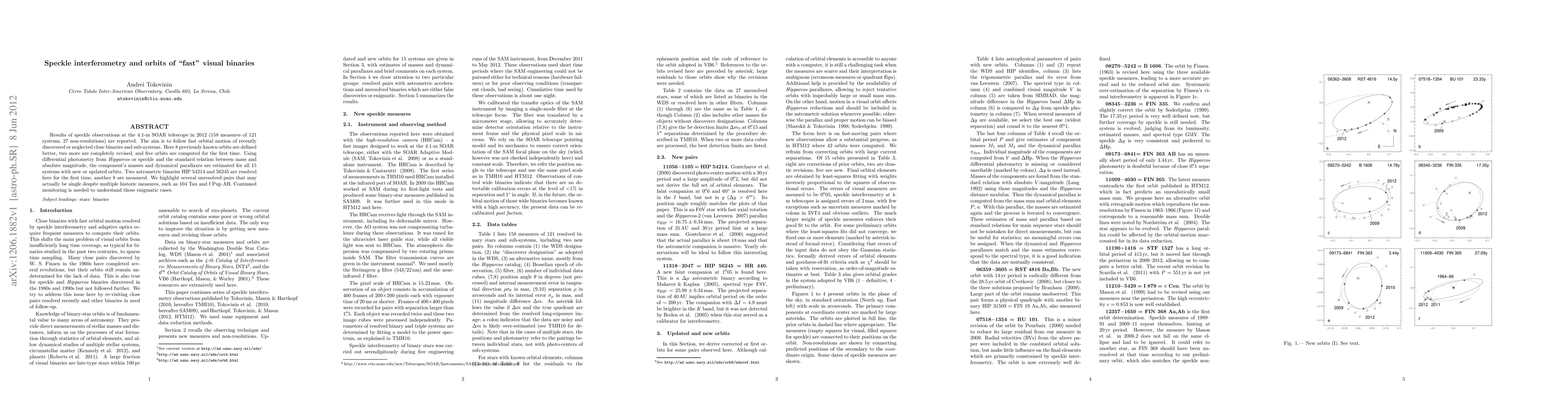 Results of speckle observations at the 4.1-m SOAR telescope in 2012 (158 measures of 121 systems, 27 non-resolutions) are reported. The aim is to follow fast orbital motion of recently discovered or neglected close binaries and sub-systems. Here 8 previously known orbits are defined better, two more are completely revised, and five orbits are computed for the first time. Using differential photometry from Hipparcos or speckle and the standard relation between mass and absolute magnitude, the component's masses and dynamical parallaxes are estimated for all 15 systems with new or updated orbits. Two astrometric binaries HIP 54214 and 56245 are resolved here for the first time, another 8 are measured. We highlight several unresolved pairs that may actually be single despite multiple historic measures, such as 104 Tau and f Pup AB. Continued monitoring is needed to understand those enigmatic cases.