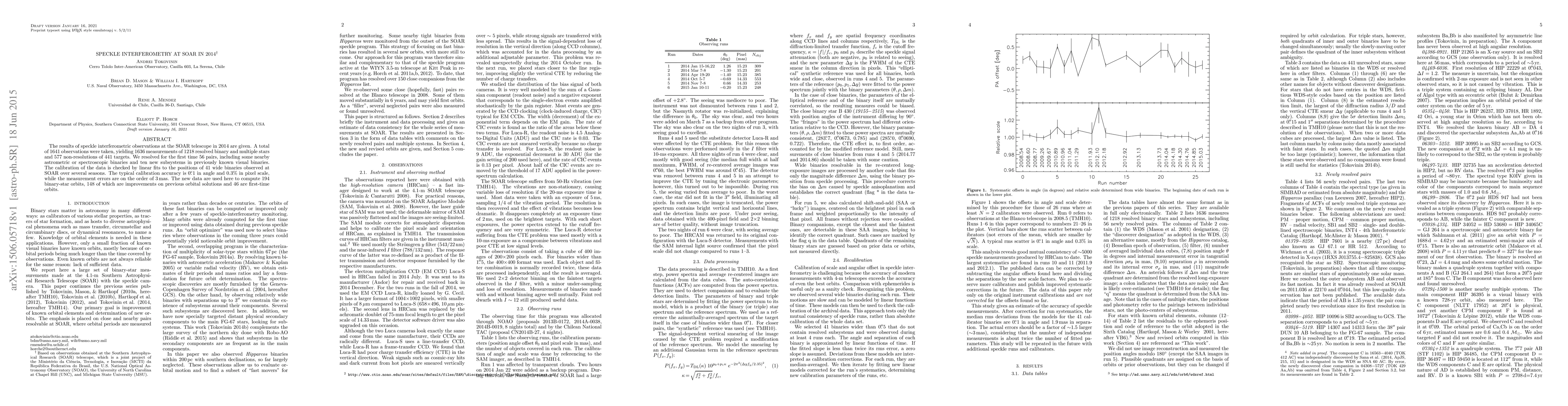 In 2014, speckle interferometric observations at the SOAR telescope led to 1636 measurements of 1218 binary and multiple stars, resolving 56 pairs for the first time. The study also computed 194 binary-star orbits, with 148 being improvements on previous solutions and 46 being first-time orbits, showcasing enhanced accuracy in calibrating stellar systems.