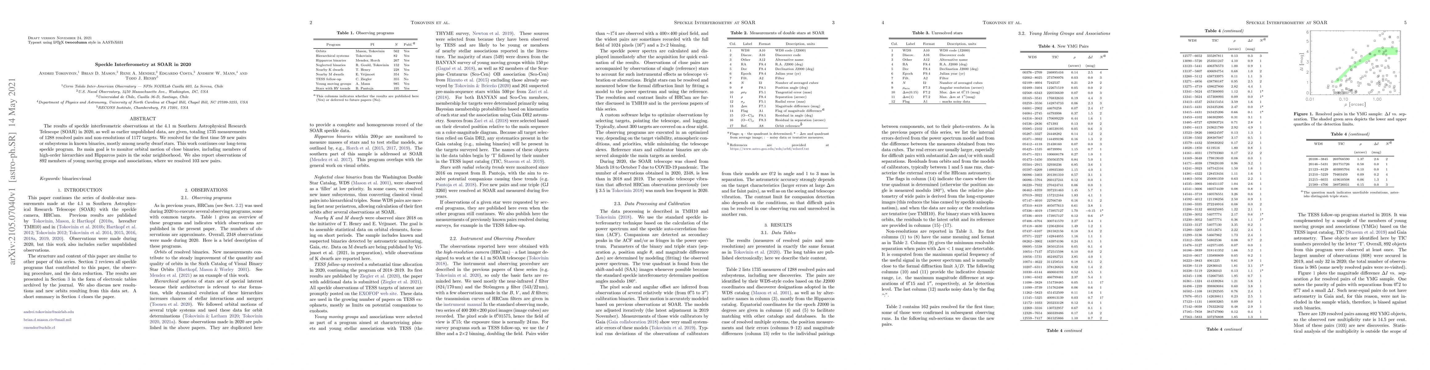 This paper presents 2020 speckle interferometry results from the SOAR telescope, including 1735 measurements of 1288 resolved pairs and 1177 targets. It reports the first resolution of 59 new pairs in nearby dwarf stars and 103 new pairs among young stellar groups, contributing to long-term monitoring of close binary orbital motions.