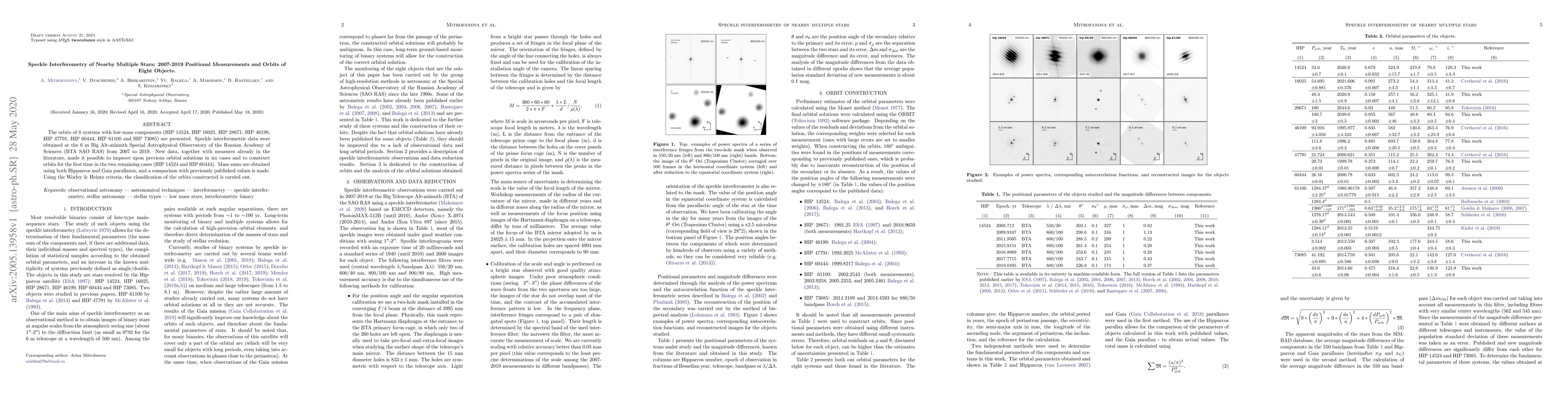 The orbits of 8 systems with low-mass components (HIP 14524, HIP 16025, HIP 28671, HIP 46199, HIP 47791, HIP 60444, HIP 61100 and HIP 73085) are presented. Speckle interferometric data were obtained at the 6 m Big Alt-azimuth Special Astrophysical Observatory of the Russian Academy of Sciences (BTA SAO RAS) from 2007 to 2019. New data, together with measures already in the literature, made it possible to improve upon previous orbital solutions in six cases and to construct orbits for the first time in the two remaining cases (HIP 14524 and HIP 60444). Mass sums are obtained using both Hipparcos and Gaia parallaxes, and a comparison with previously published values is made. Using the Worley & Heintz criteria, the classiffcation of the orbits constructed is carried out.