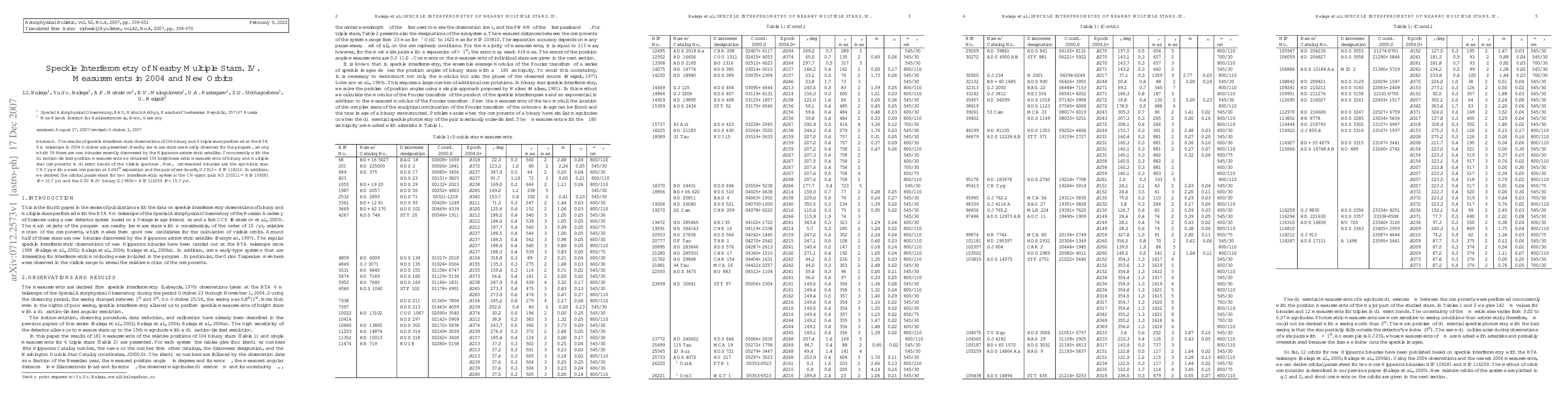 The results of speckle interferometric observations of 104 binary and 6 triple stars performed at the BTA 6 m telescope in 2004 October are presented. Nearby low-mass stars are mostly observed for the program, among which 59 there are new binaries recently discovered by the Hipparcos astrometric satellite. Concurrently with the diffraction-limited position measurements we obtained 154 brightness ratio measurements of binary and multiple star components in different bands of the visible spectrum. New, first-resolved binaries are the symbiotic star CH Cyg with a weak companion at 0.043'' separation and the pair of red dwarfs, GJ 913 = HIP 118212. In addition, we derived the orbital parameters for two interferometric systems: the CN-giant pair HD 210211 = HIP 109281 (P=10.7 yr) and the G2V-K2V binary GJ 9830 = HIP 116259 (P=15.7 yr).