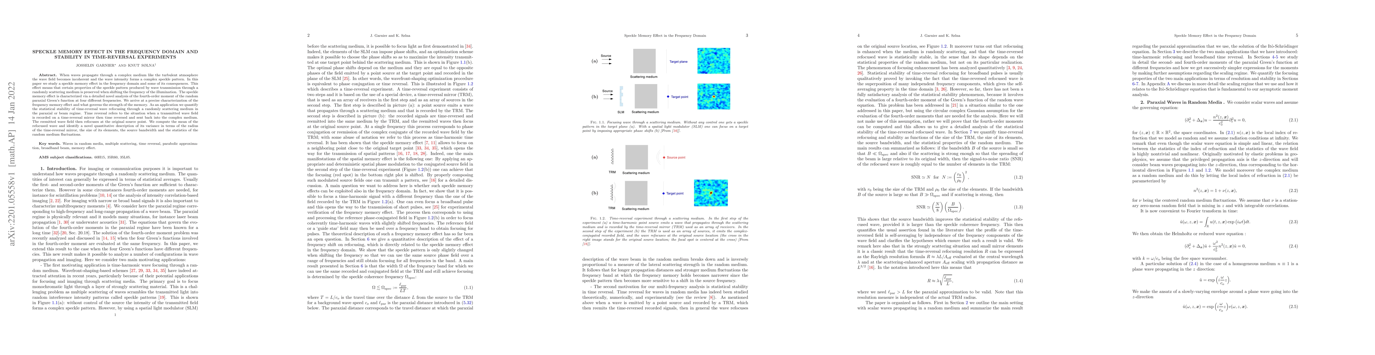 When waves propagate through a complex medium like the turbulent atmosphere the wave field becomes incoherent and the wave intensity forms a complex speckle pattern. In this paper we study a speckle memory effect in the frequency domain and some of its consequences. This effect means that certain properties of the speckle pattern produced by wave transmission through a randomly scattering medium is preserved when shifting the frequency of the illumination. The speckle memory effect is characterized via a detailed novel analysis of the fourth-order moment of the random paraxial Green's function at four different frequencies. We arrive at a precise characterization of the frequency memory effect and what governs the strength of the memory. As an application we quantify the statistical stability of time-reversal wave refocusing through a randomly scattering medium in the paraxial or beam regime. Time reversal refers to the situation when a transmitted wave field is recorded on a time-reversal mirror then time reversed and sent back into the complex medium. The reemitted wave field then refocuses at the original source point. We compute the mean of the refocused wave and identify a novel quantitative description of its variance in terms of the radius of the time-reversal mirror, the size of its elements, the source bandwidth and the statistics of the random medium fluctuations.