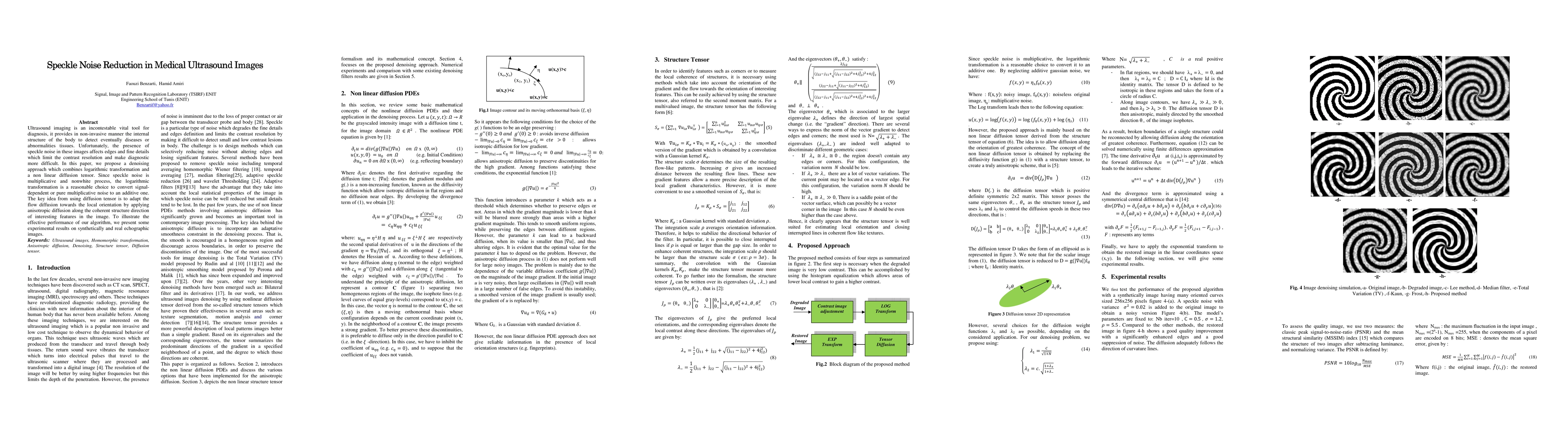 Ultrasound imaging is an incontestable vital tool for diagnosis, it provides in non-invasive manner the internal structure of the body to detect eventually diseases or abnormalities tissues. Unfortunately, the presence of speckle noise in these images affects edges and fine details which limit the contrast resolution and make diagnostic more difficult. In this paper, we propose a denoising approach which combines logarithmic transformation and a non linear diffusion tensor. Since speckle noise is multiplicative and nonwhite process, the logarithmic transformation is a reasonable choice to convert signaldependent or pure multiplicative noise to an additive one. The key idea from using diffusion tensor is to adapt the flow diffusion towards the local orientation by applying anisotropic diffusion along the coherent structure direction of interesting features in the image. To illustrate the effective performance of our algorithm, we present some experimental results on synthetically and real echographic images.