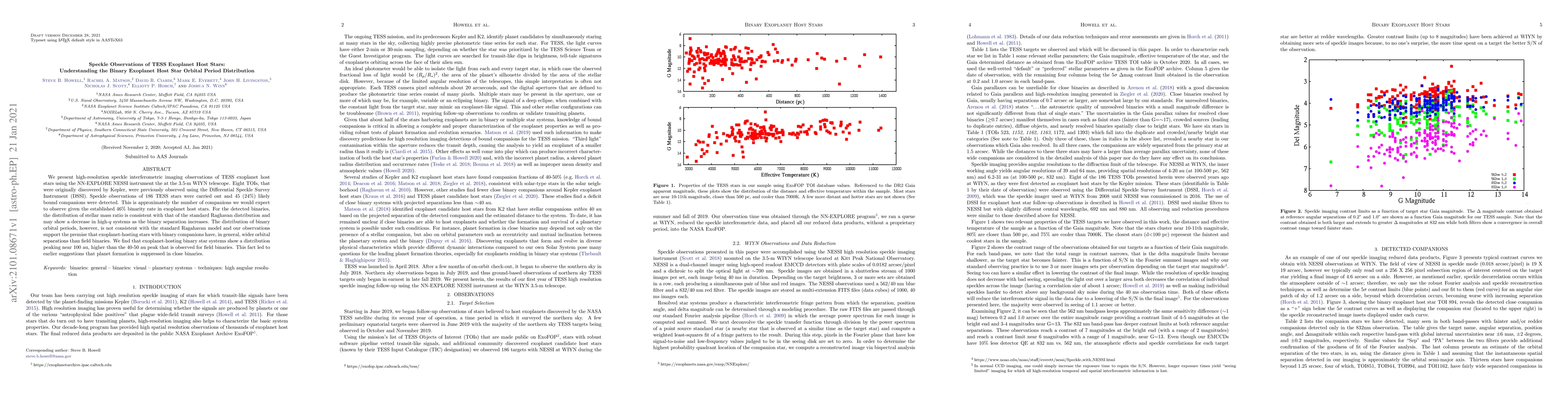 We present high-resolution speckle interferometric imaging observations of TESS exoplanet host stars using the NN-EXPLORE NESSI instrument the at the 3.5-m WIYN telescope. Eight TOIs, that were originally discovered by Kepler, were previously observed using the Differential Speckle Survey Instrument (DSSI). Speckle observations of 186 TESS stars were carried out and 45 (24%) likely bound companions were detected. This is approximately the number of companions we would expect to observe given the established 46% binarity rate in exoplanet host stars. For the detected binaries, the distribution of stellar mass ratio is consistent with that of the standard Raghavan distribution and may show a decrease in high-q systems as the binary separation increases. The distribution of binary orbital periods, however, is not consistent with the standard Ragahavan model and our observations support the premise that exoplanet-hosting stars with binary companions have, in general, wider orbital separations than field binaries. We find that exoplanet-hosting binary star systems show a distribution peaking near 100 au, higher than the 40-50 au peak that is observed for field binaries. This fact led to earlier suggestions that planet formation is suppressed in close binaries.