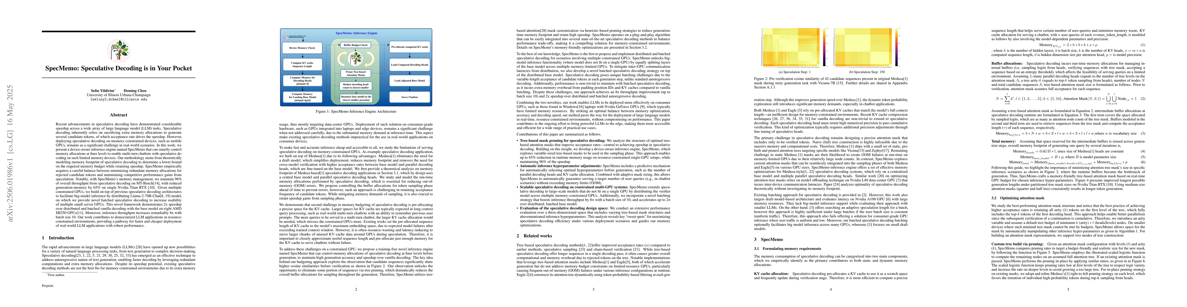 Researchers developed SpecMemo, a device-aware inference engine that optimizes memory usage for large language models on limited devices, achieving 96% of original throughput with 65% reduction in generation memory.