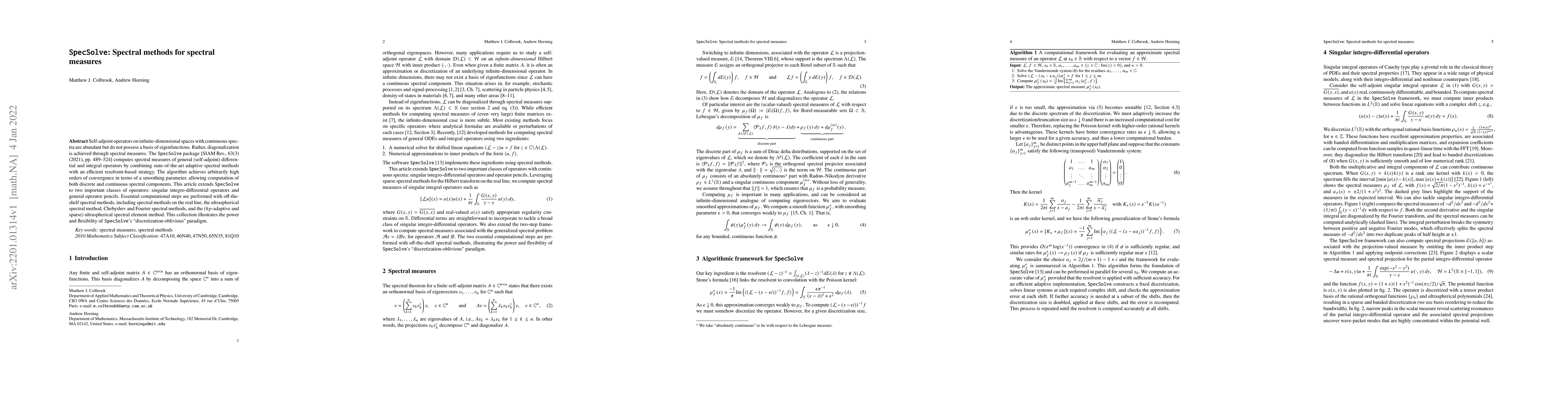 Self-adjoint operators on infinite-dimensional spaces with continuous spectra are abundant but do not possess a basis of eigenfunctions. Rather, diagonalization is achieved through spectral measures. The SpecSolve package [SIAM Rev., 63(3) (2021), pp. 489--524] computes spectral measures of general (self-adjoint) differential and integral operators by combining state-of-the-art adaptive spectral methods with an efficient resolvent-based strategy. The algorithm achieves arbitrarily high orders of convergence in terms of a smoothing parameter, allowing computation of both discrete and continuous spectral components. This article extends SpecSolve to two important classes of operators: singular integro-differential operators and general operator pencils. Essential computational steps are performed with off-the-shelf spectral methods, including spectral methods on the real line, the ultraspherical spectral method, Chebyshev and Fourier spectral methods, and the ($hp$-adaptive and sparse) ultraspherical spectral element method. This collection illustrates the power and flexibility of SpecSolve's "discretization-oblivious" paradigm.