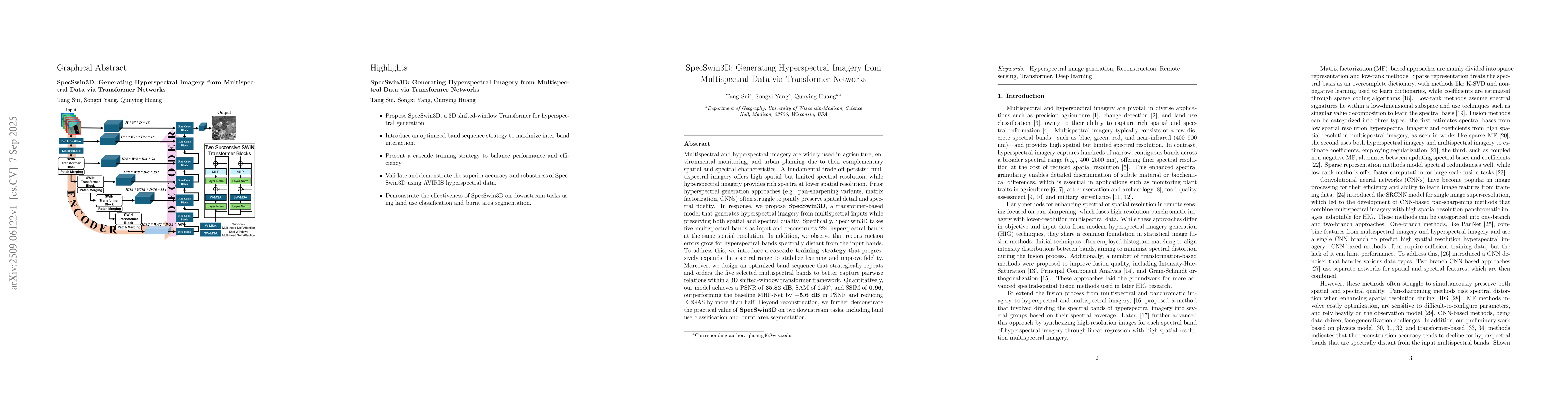 Multispectral and hyperspectral imagery are widely used in agriculture, environmental monitoring, and urban planning due to their complementary spatial and spectral characteristics. A fundamental trade-off persists: multispectral imagery offers high spatial but limited spectral resolution, while hyperspectral imagery provides rich spectra at lower spatial resolution. Prior hyperspectral generation approaches (e.g., pan-sharpening variants, matrix factorization, CNNs) often struggle to jointly preserve spatial detail and spectral fidelity. In response, we propose SpecSwin3D, a transformer-based model that generates hyperspectral imagery from multispectral inputs while preserving both spatial and spectral quality. Specifically, SpecSwin3D takes five multispectral bands as input and reconstructs 224 hyperspectral bands at the same spatial resolution. In addition, we observe that reconstruction errors grow for hyperspectral bands spectrally distant from the input bands. To address this, we introduce a cascade training strategy that progressively expands the spectral range to stabilize learning and improve fidelity. Moreover, we design an optimized band sequence that strategically repeats and orders the five selected multispectral bands to better capture pairwise relations within a 3D shifted-window transformer framework. Quantitatively, our model achieves a PSNR of 35.82 dB, SAM of 2.40{\deg}, and SSIM of 0.96, outperforming the baseline MHF-Net by +5.6 dB in PSNR and reducing ERGAS by more than half. Beyond reconstruction, we further demonstrate the practical value of SpecSwin3D on two downstream tasks, including land use classification and burnt area segmentation.